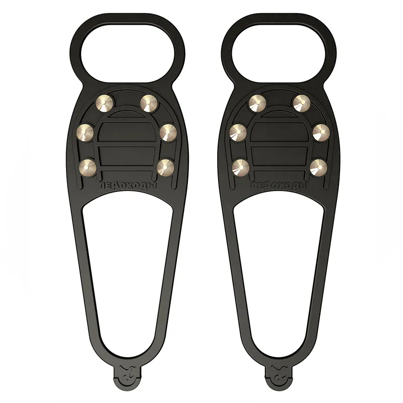 Съемные резиновые насадки на обувь с небольшими металлическими шипами для безопасной и уверенной ходьбы в гололед. Надежно защищают от падений и травм. На каждой насадке расположено по 6 металлических шипов. Расположены они полукругом, что обеспечивает как оптимальное сцепление с обледенелой поверхностью, так и максимальное удобство при ходьбе. При этом шипы держатся в посадочных гнёздах прочно и не выпадают при использовании ледоходов. Морозостойкое резиновое рифление по всей поверхности между шипами создает дополнительное сцепление с обледенелой поверхностью. Удобная резиновая скобка на язычке упрощает эксплуатацию. Легко и просто надеваются на любую обувь, в том числе с каблуком.