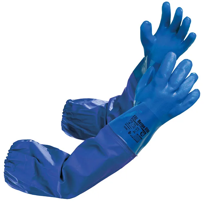 Перчатки из хлопчатобумажного трикотажа с припаянным нарукавником из модифицированного поливинилхлорида для защиты от механических воздействий, нефти, нефтепродуктов, минеральных масел, кислот и щелочей. Перчатки оборудованы подкладкой с антибактериальной обработкой ACTIFRESH™.