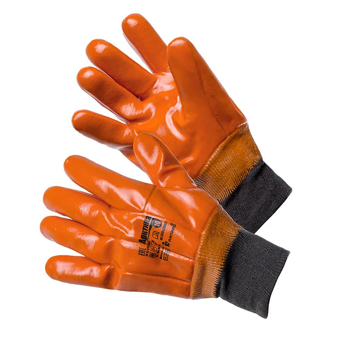 Утепленные прочные перчатки с ПВХ покрытием для защиты от механических воздействий и химических факторов.
