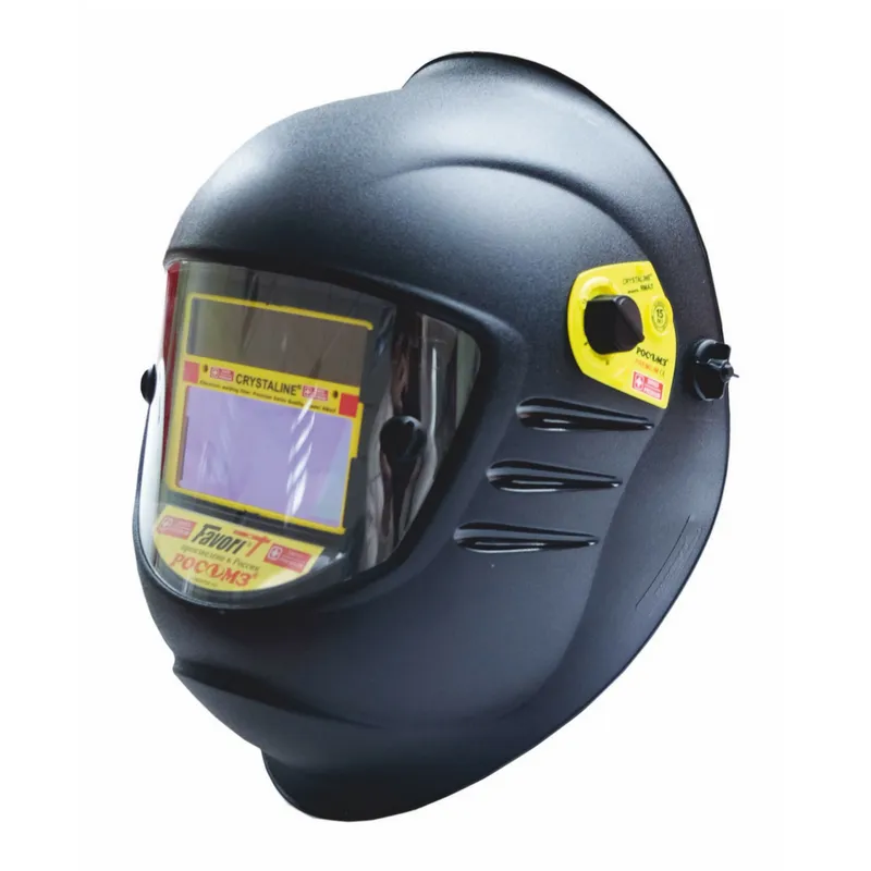Крепление на каске с помощью специальных универсальных адаптеров (в комплекте), фиксируется в двух максимально выгодных положениях: рабочем (внизу) и не рабочем (вверху).