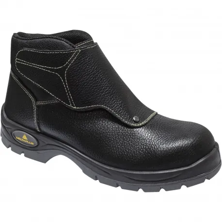Ботинки из пигментированного кожевенного спилка с защитным клапаном, закрываемым с помощью контактной ленты. Влагонепроницаемые. Металлический защитный подносок. Литьевой метод крепления подошвы. Подошва двухслойная, устойчивая к проколам (вшитая стальная стелька) и к скольжению (тест SRC). Съемная формованная стелька. Швы выполнены из жаростойких пара-арамидных нитей. Изоляция подошвы от жары. Ботинки соответствуют требованиям к обуви для сварочных работ.