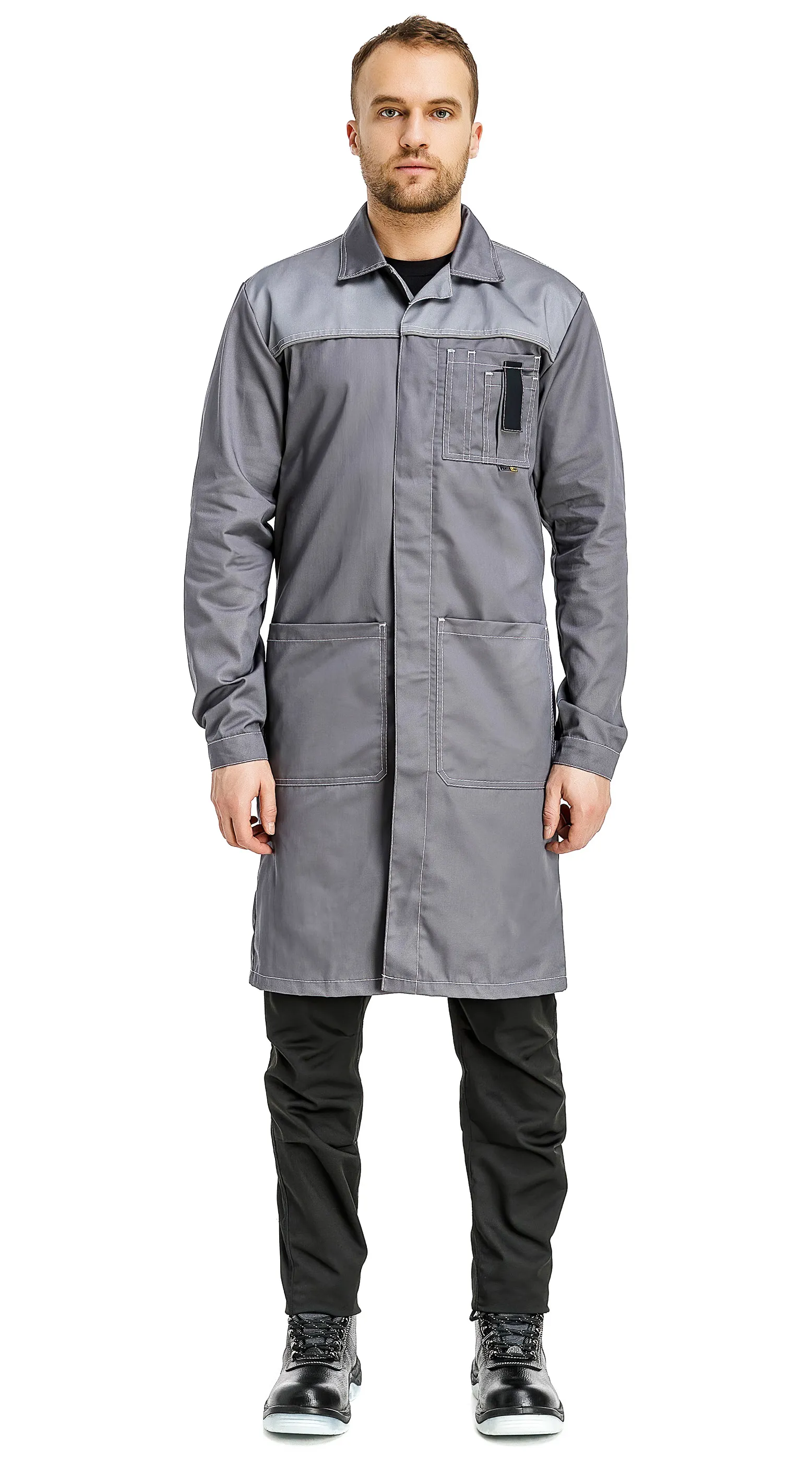 Выполнен из прочной и плотной ткани TC TWILL, прошит сверхпрочными толстыми (70АП) нитками контрастного светло-серого цвета с армированным сердечником. Купить рабочий халат можно оптом и в розницу в нашем интернет-магазине.
