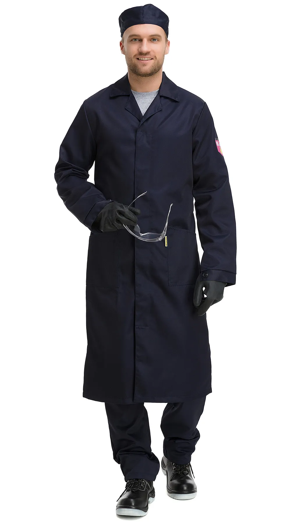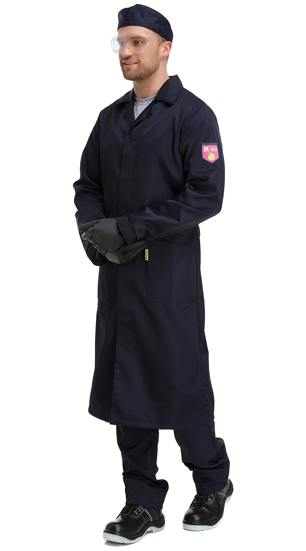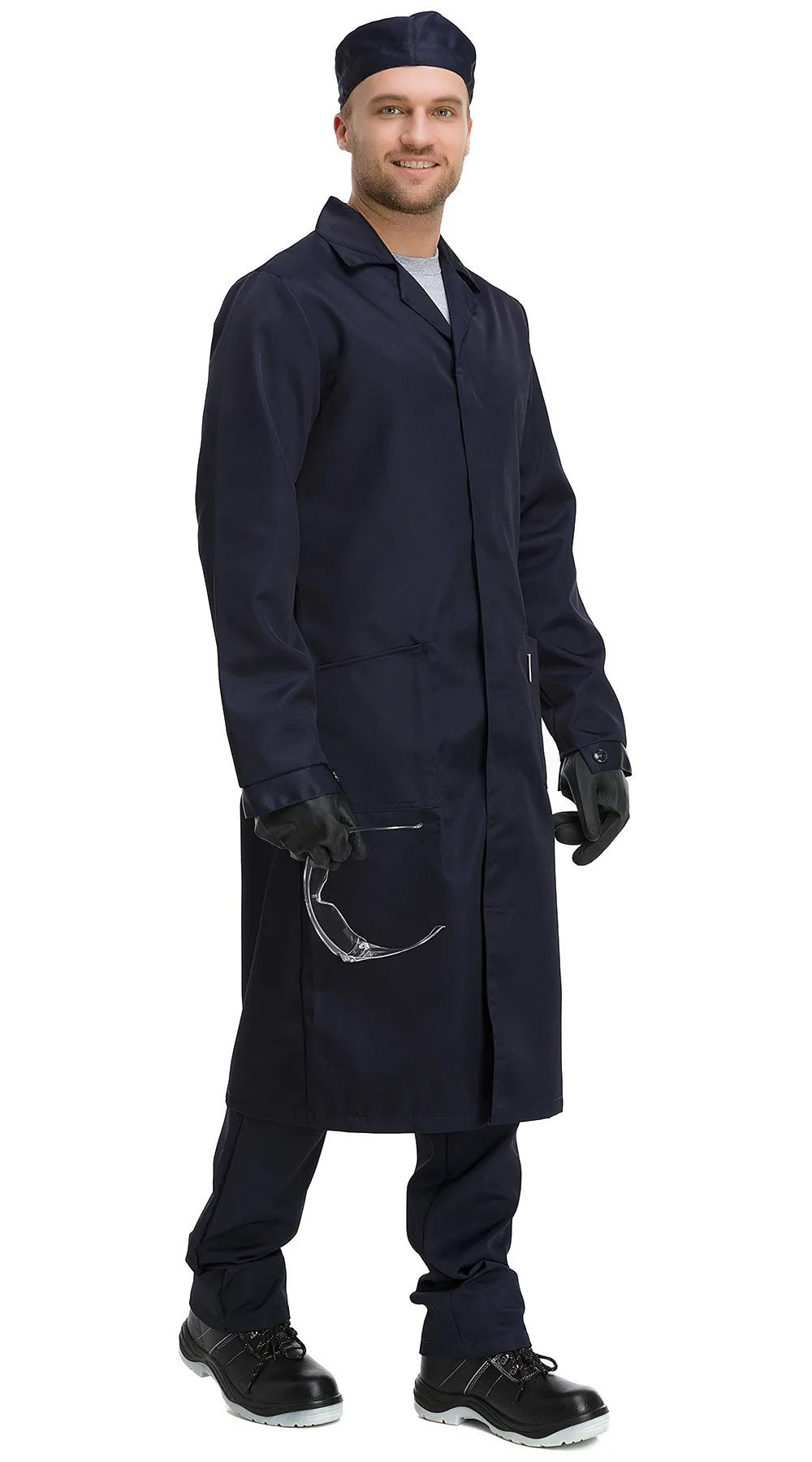 Защита от кислот до 80%. Халат с кокеткой, супатной застежкой на пуговицы, накладными карманами, отложным воротником.