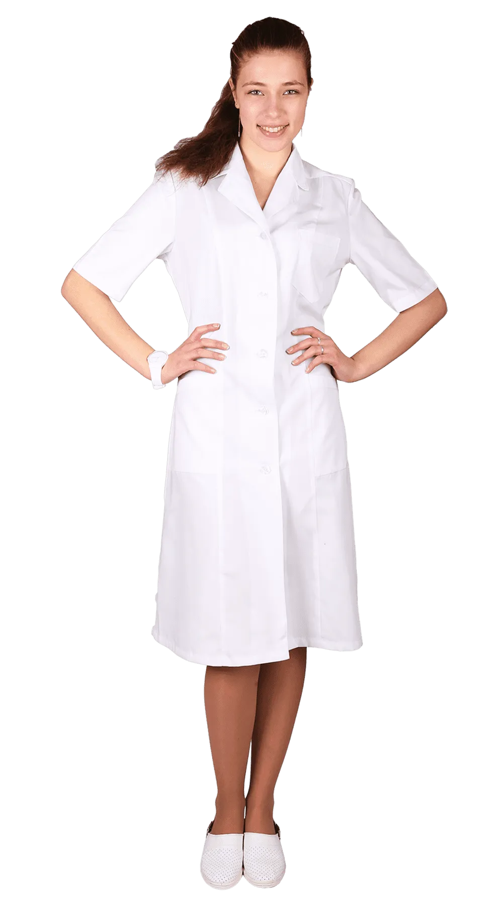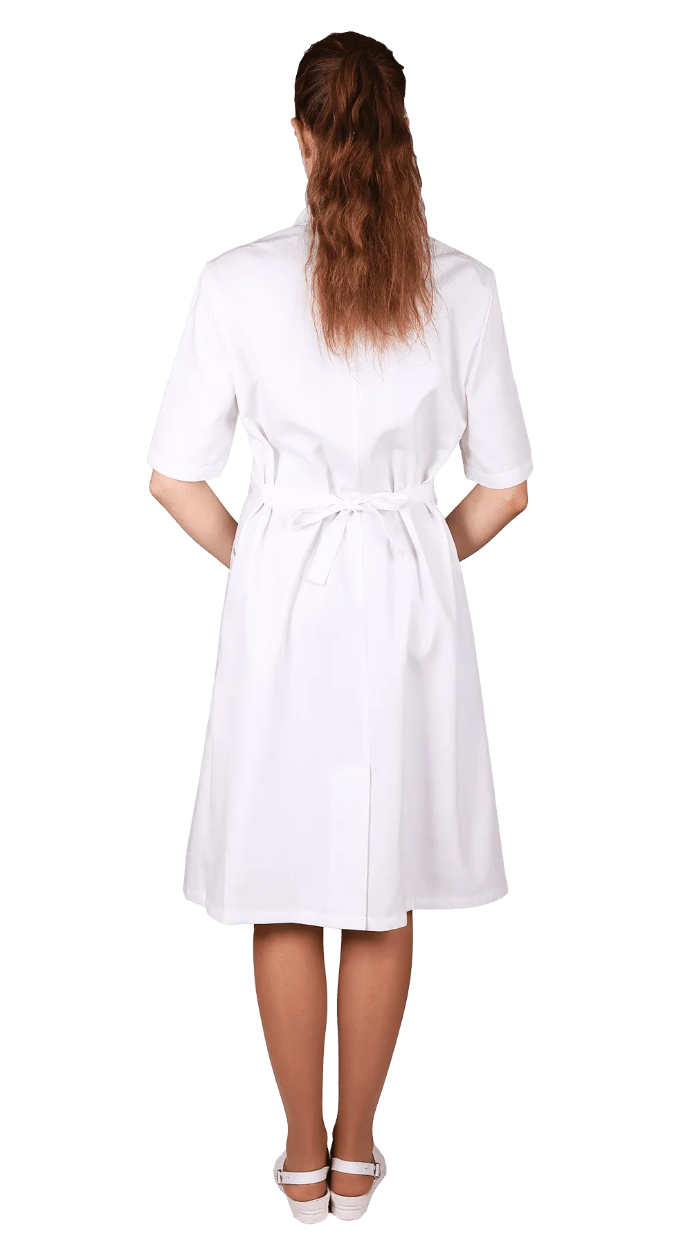 Халат с застежкой на пуговицы, с коротким рукавом, объем по талии регулируется хлястиком. Цвет: белый. Ткань: смесовая «ТиСи» (65% полиэфир, 35% хлопок) пл.120 г/м2.