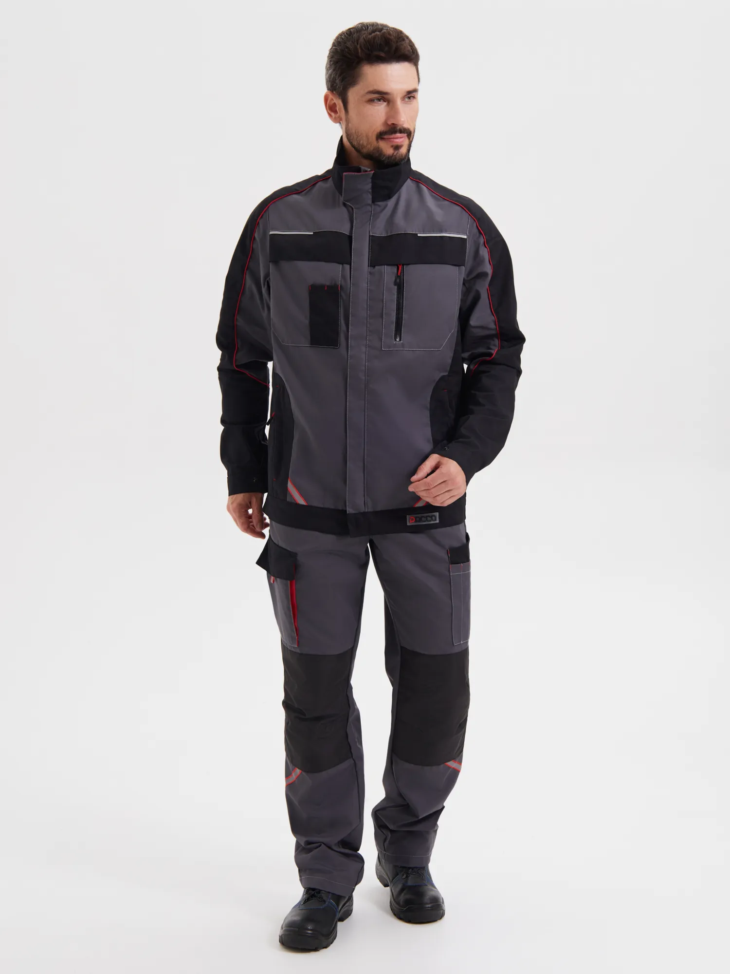 Куртка прямого силуэта с воротником-стойкой, с центральной застёжкой на молнию и ветрозащитный клапан застёгивающийся на две потайные кнопки. Два нагрудных и два боковых кармана. Верхний левый карман накладной с дополнительным накладным отделом для карандаша. Верхний правый карман накладной с застёжкой - “молнией”. Нижние боковые карманы вертикальные с застёжкой на молнию. Брюки с центральной застежкой на молнию с резинкой по боковым сторонам пояса. Пояс со шлевками. Функциональные карманы по бокам. Усилительные объемные наколенники из ткани ТАСЛАН предохраняют от протирания.