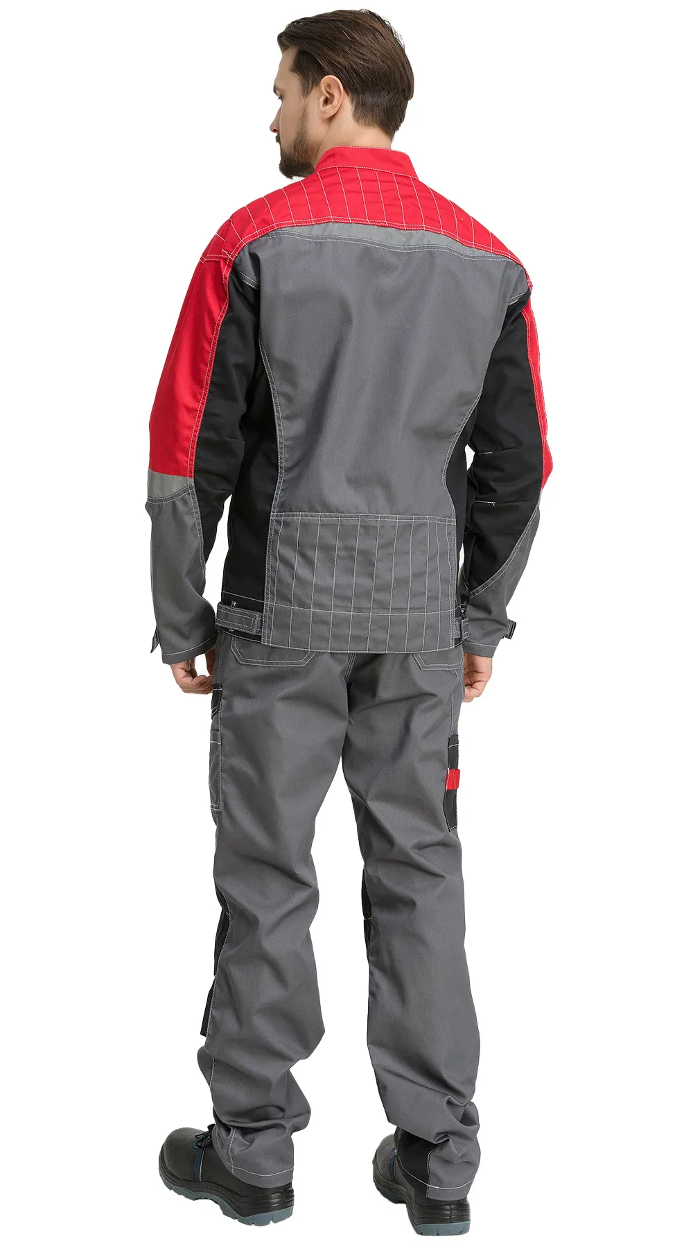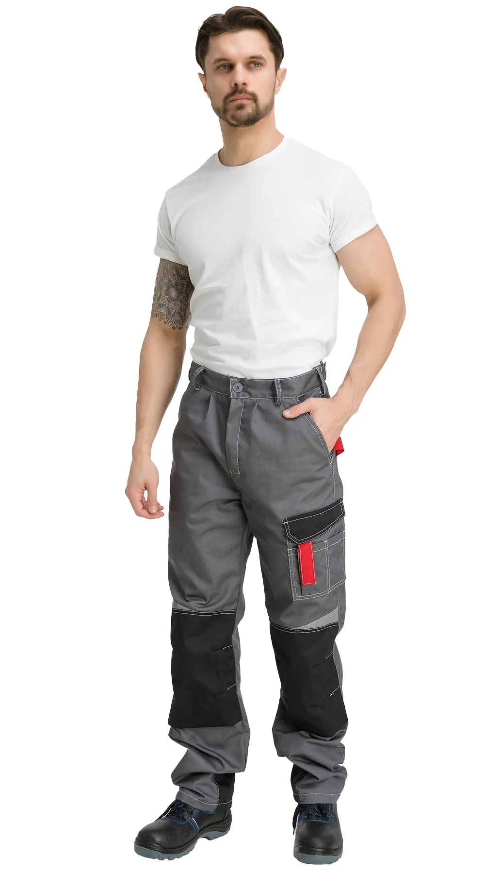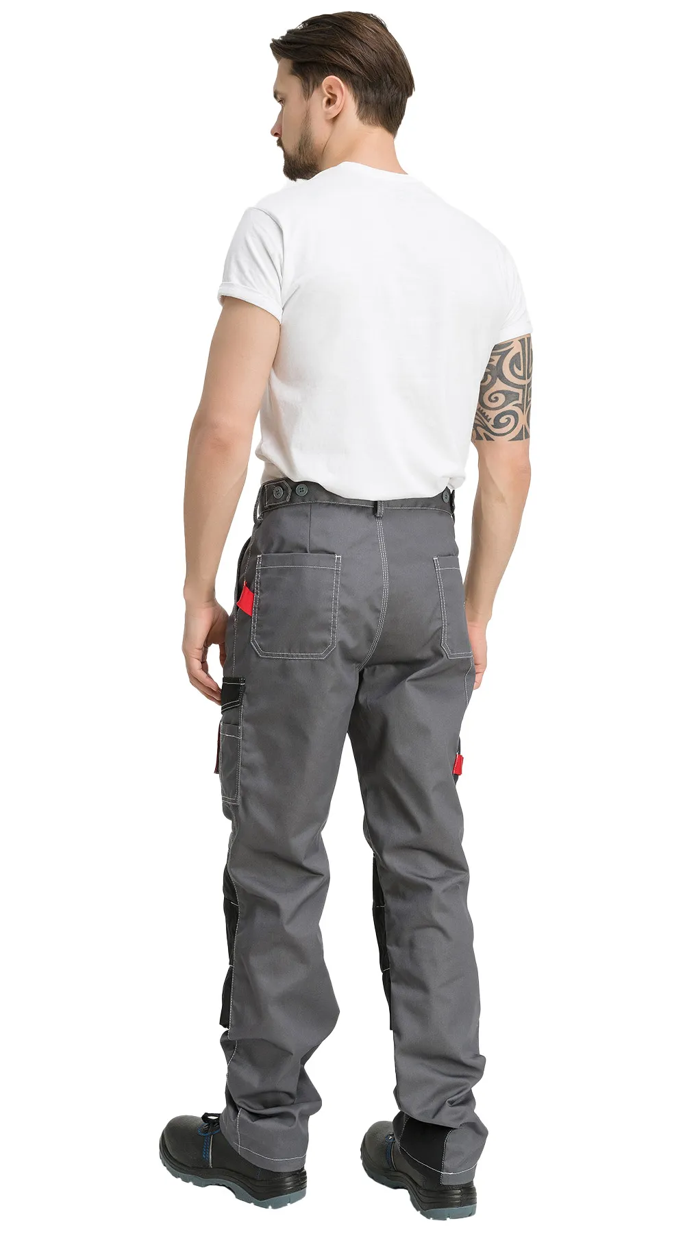 Брюки умеренного объема, с застежкой гульфик на тесьму-молнию, притачным поясом на пуговице и пятью шлевками и патами по бокам на пуговицах, с возможной регулировкой. На передних половинках карманы в отрезном бочке. Объемные усилительные накладки в области колена, за счет вытачек, с карманами для амортизационных вкладышей.