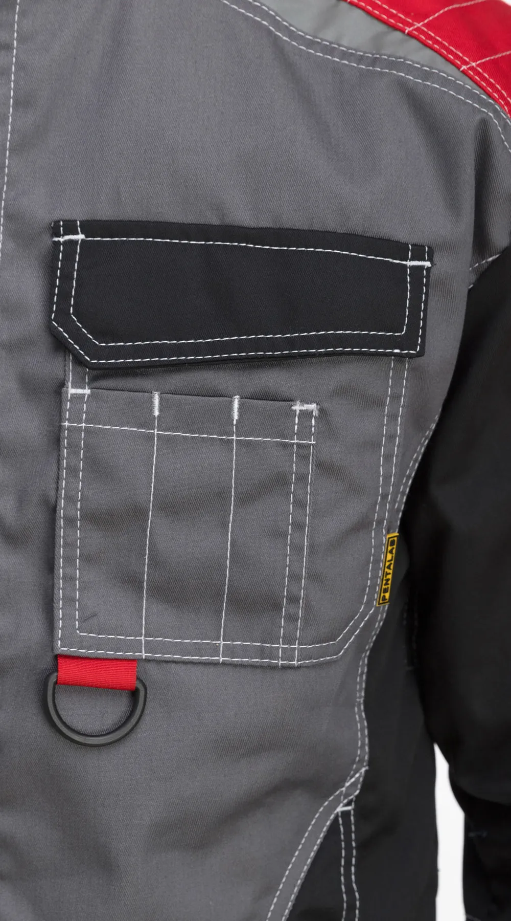 Слева от кармана петля для инструментов, под правым–вдоль бокового шва, двойной карман для инструментов со стропой, усиленной закрепками.