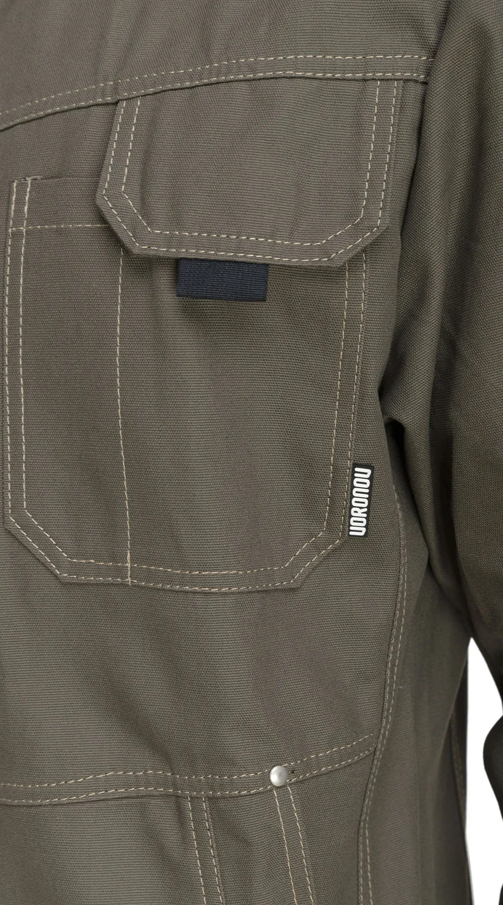 На средней части полочек накладные карманы. Правый карман с двумя разделительными строчками, левый с отделением под карандаш и с клапаном. Нижние карманы с наклонным входом.