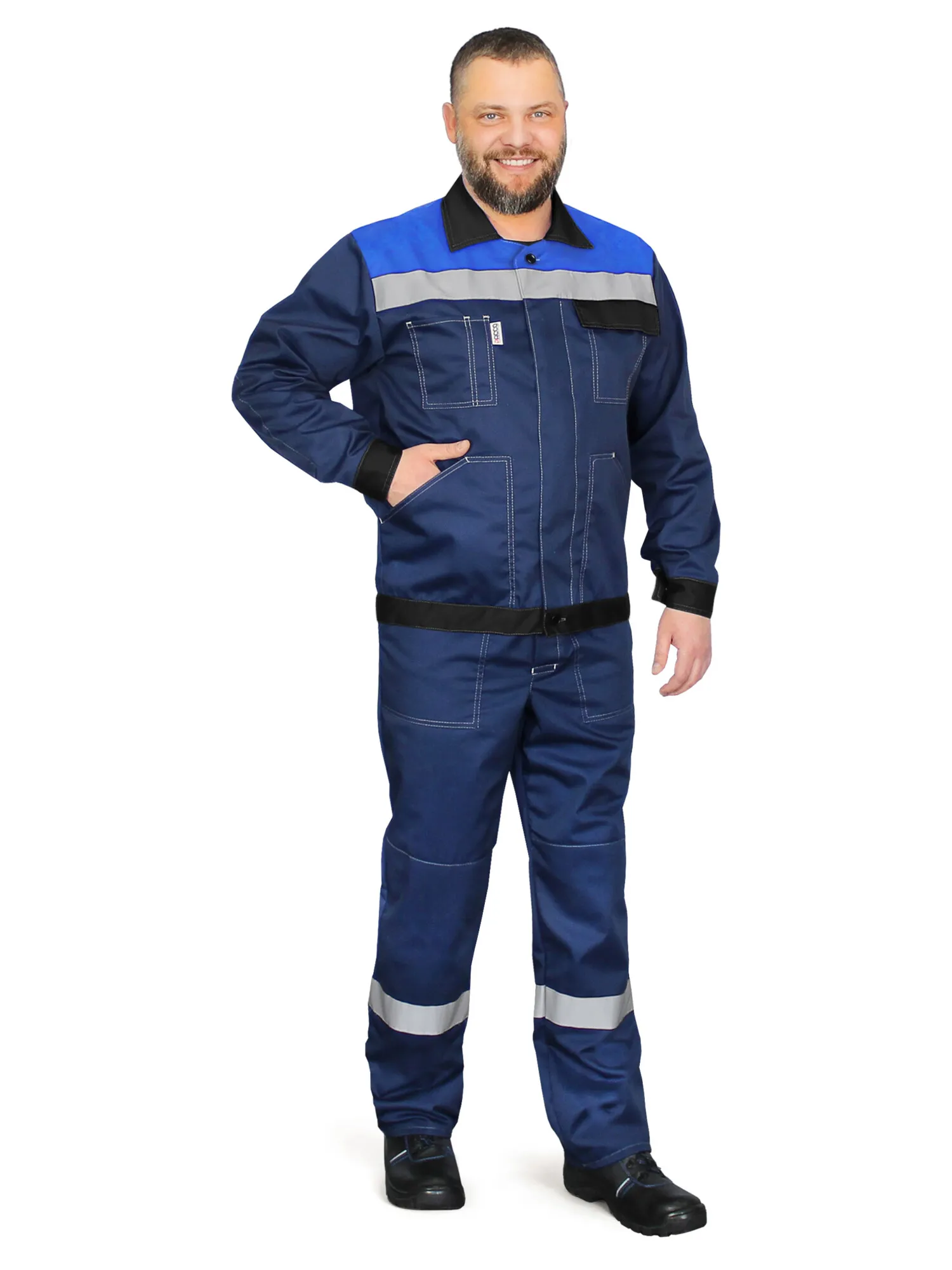 Куртка прямого силуэта c притачным поясом и отложным воротником. Центральная бортовая супатная застёжка на пуговицы. На куртке имеются два нагрудных, где левый карман с клапаном на текстильной застёжке, и два нижних накладных кармана. В области локтей имеются усиления. Манжеты рукавов застёгиваются на пуговицу. На кокетках полочки и спинки, расположена световозвращающая лента шириной 50 мм. Полукомбинезон с регулируемыми бретелями с застежкой на фастексы. По талии спинки - резинка. Объём полукомбинезона регулируется при помощи пуговиц, расположенных с правой стороны. Имеется один центральный карман с клапаном и боковые карманы с косым входом. По нижней части полукомбинезона расположена световозвращающая лента шириной 50 мм. В области коленей имеются усиления.
