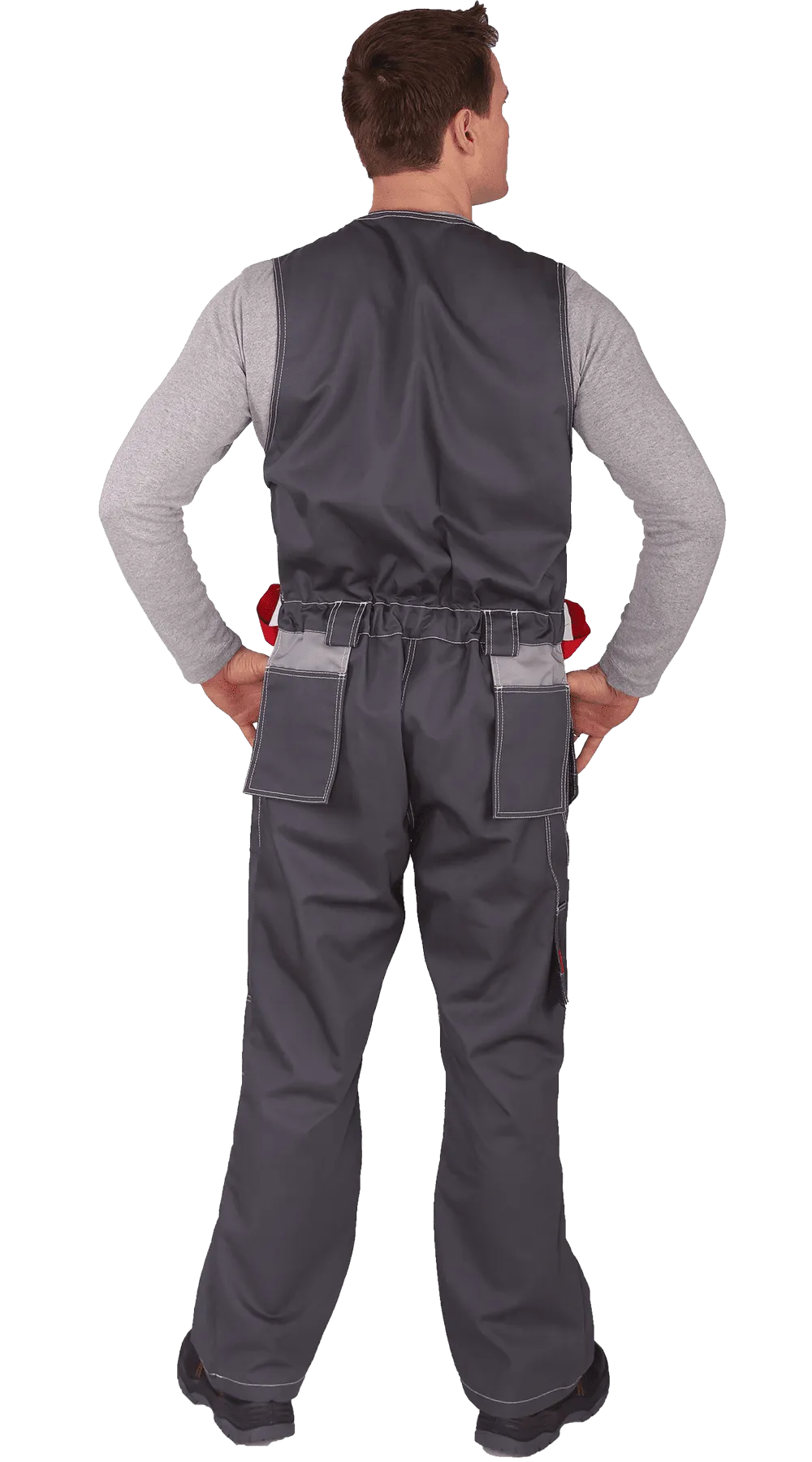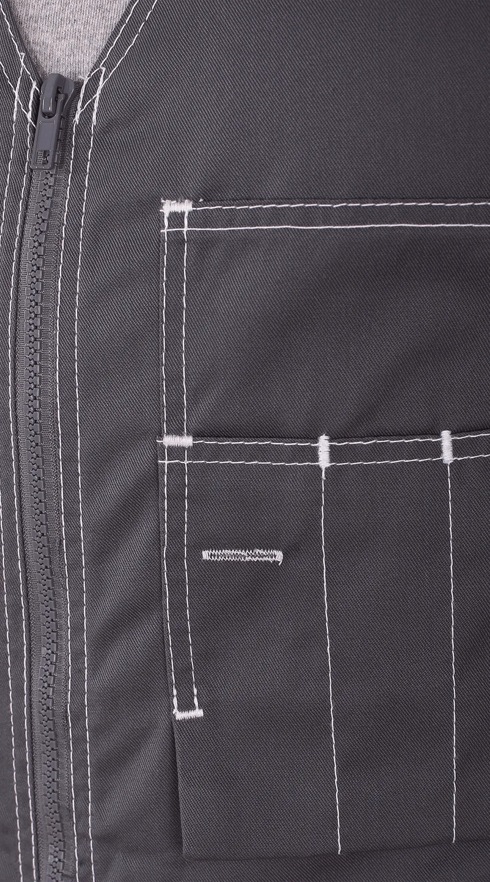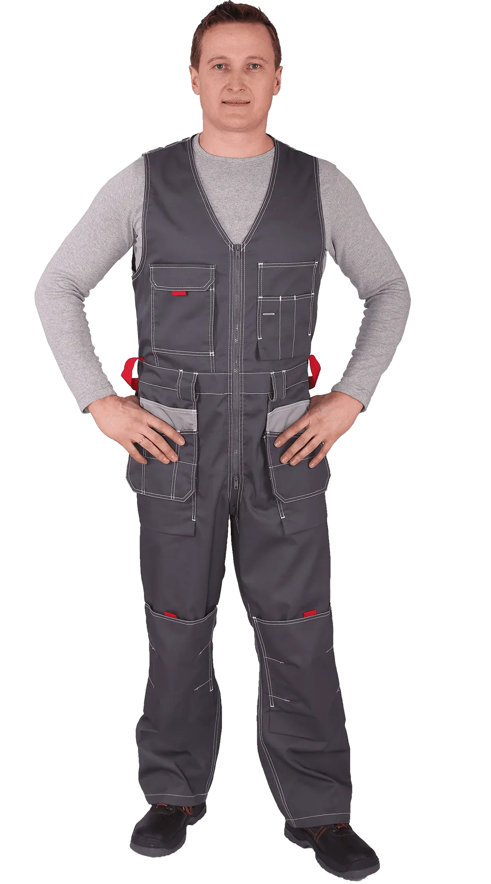Полукомбинезон жилеточный с застежкой на молнию, с притачным поясом со шлевками. Оснащен множеством накладных и отлетных многофункциональных карманов с отделениями для инструментов. В районе колен расположенны усилительные накладки-карманы для амортизационных прокладок, с застежкой на липучку. Цвет: серый со светло-серой отделкой. Ткань: TC TWILL, 65% п/э, 35% хлопок, 240 г/м2. Стойкость к частым промышленным стиркам (при t 85°C) обеспечивает минимальную усадку изделия, стойкость цвета и отсутствие пиллинга. Отделка «легкий уход» позволяет не гладить одежду после сушки в расправленном виде. Размер: с 88-92 по 120-124. Рост: 170-176, 182-188. ГОСТ 27575-87. ТР ТС 019/2011.