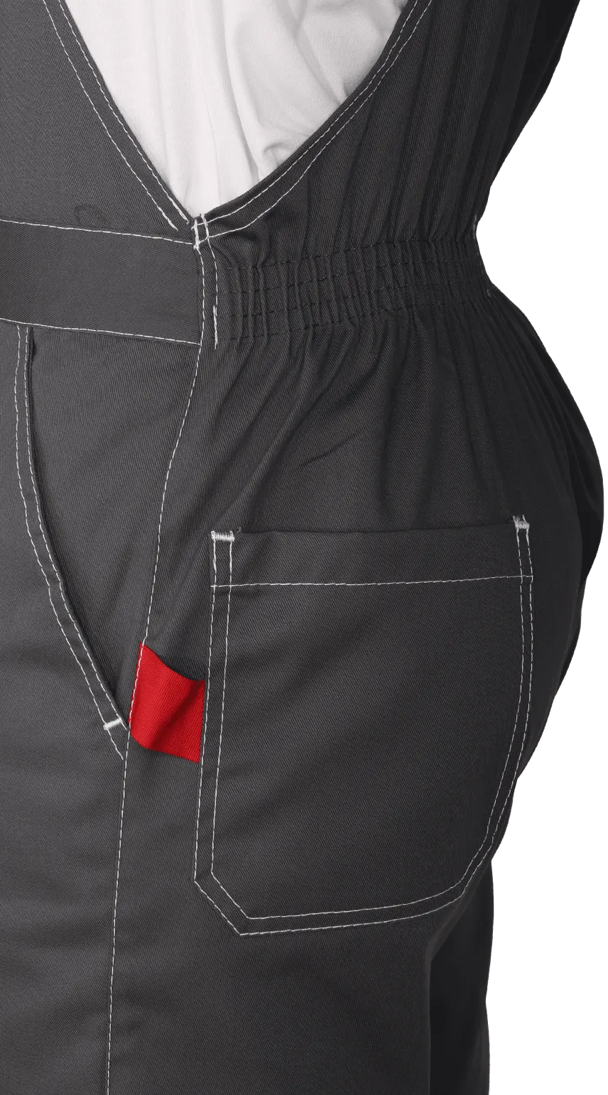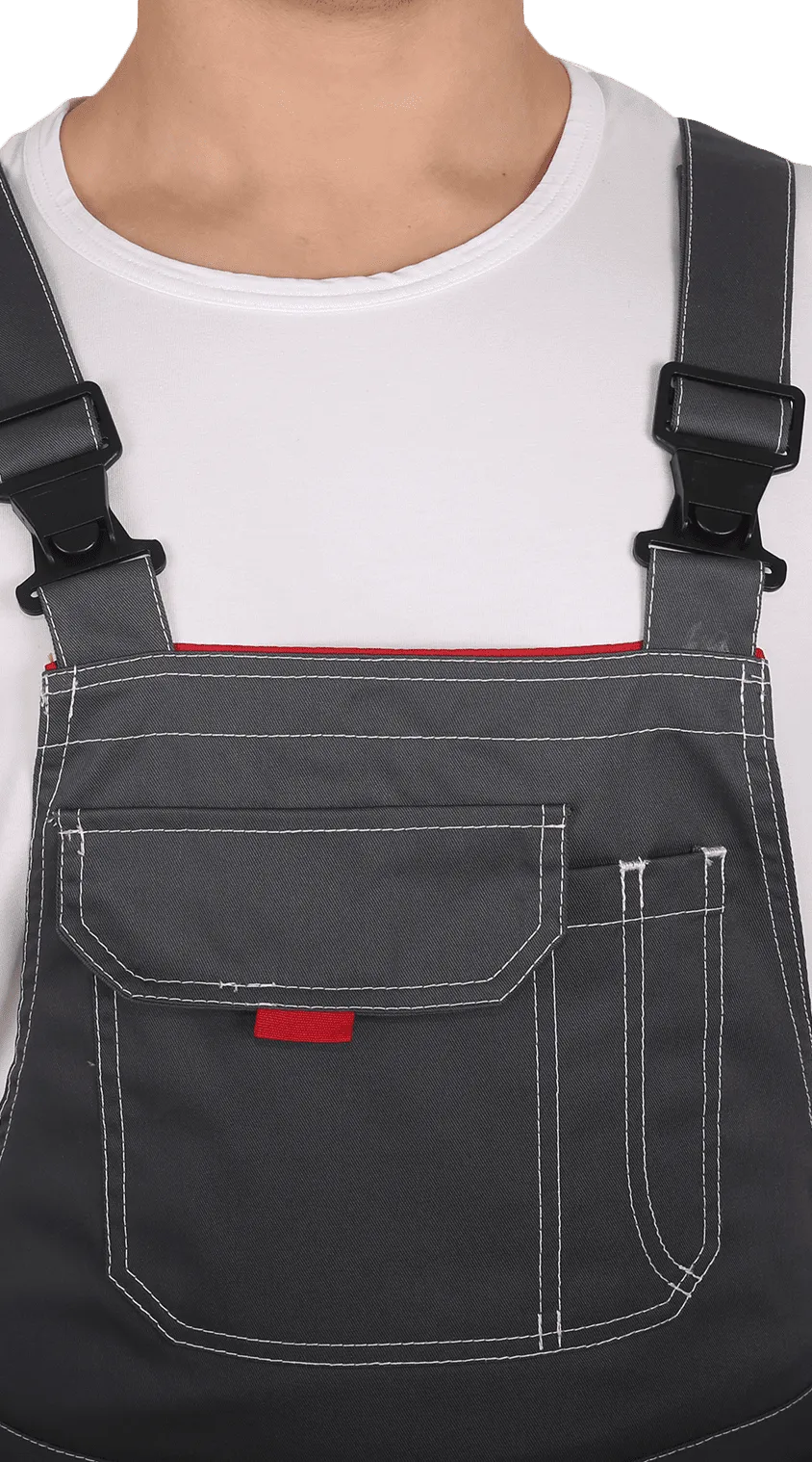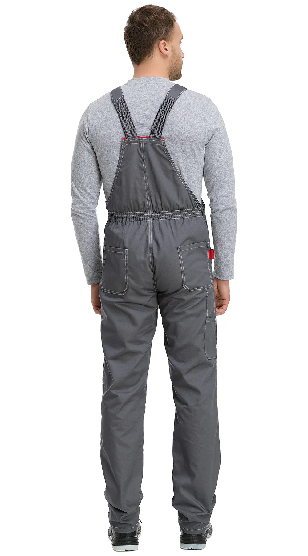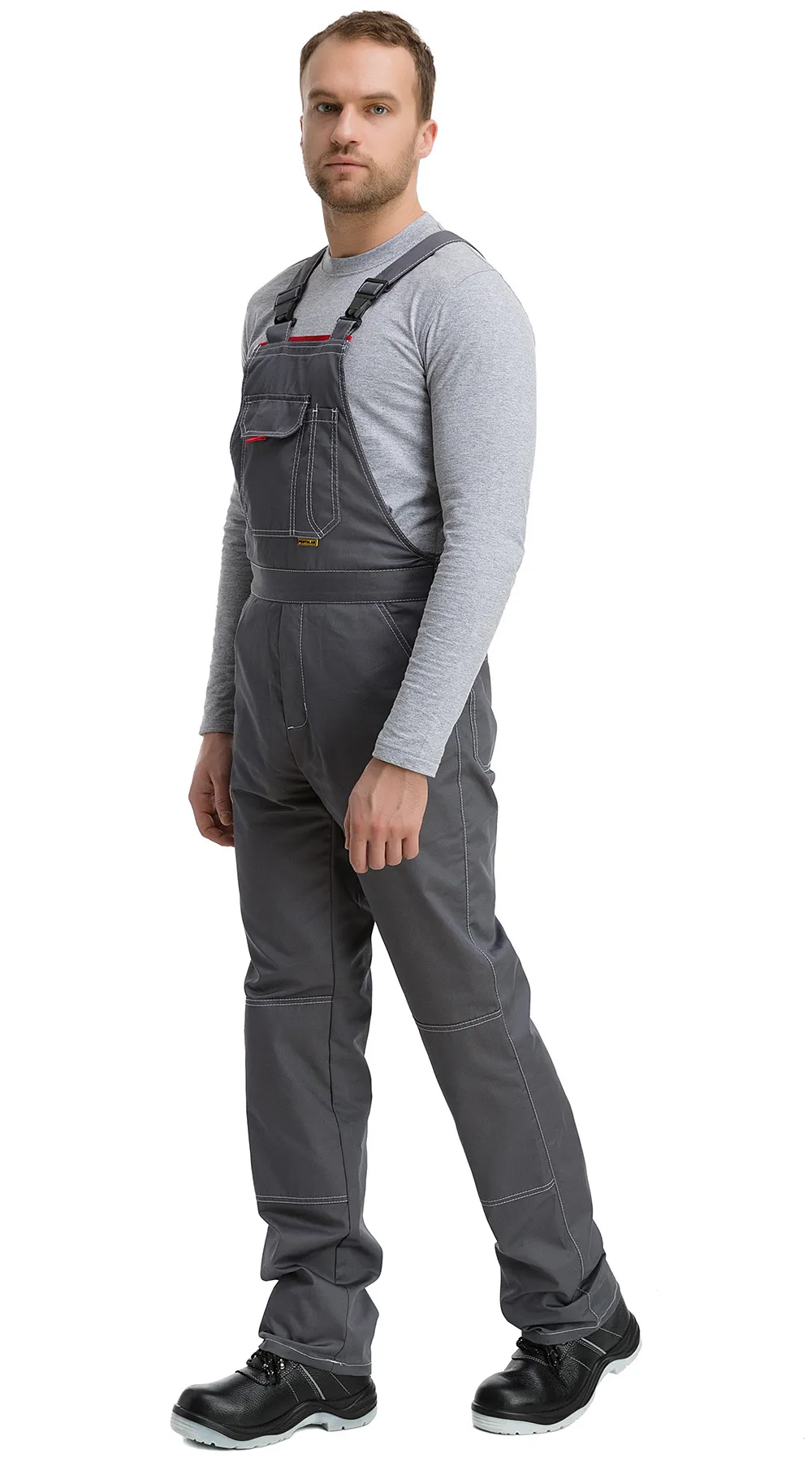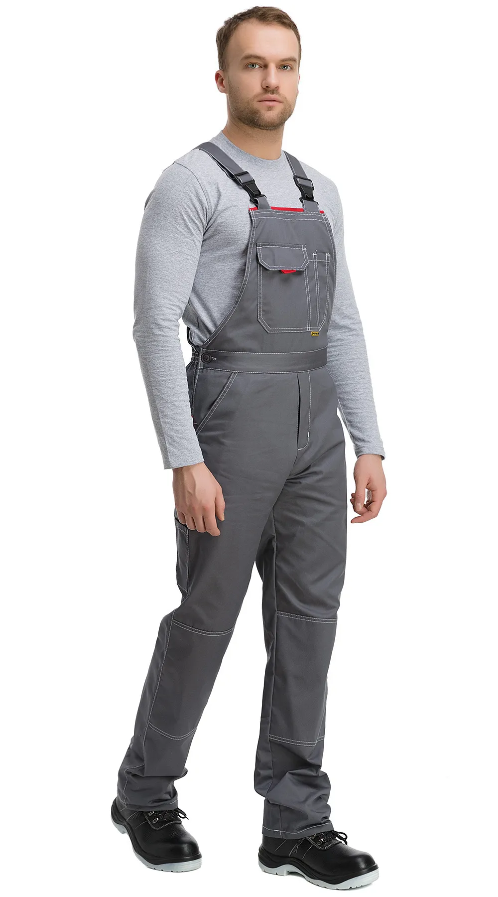 Полукомбинезон на бретелях с эластичной тесьмой, пристегивающийся на фастексы, с притачным поясом, с застежкой-гульфиком на молнию, с застежкой в правом боковом шве на пуговицы. На грудке п/к расположен широкий карман с тремя отделениями, крайнее правое отделение с клапаном на липучке и с патой из контрастной ткани. Усиления в области коленей обеспечивают дополнительную износостойкость и защиту коленей от ссадин и царапин. На задних половинках п/к расположены накладные карманы с петлей и карманом под инструменты. По линии талии задних половинок расположена кулиса с эластичной тесьмой. Цвет: серый. Ткань: TC TWILL, 65% п/э, 35% хлопок, 240 г/м2. Размер: с 88-92 по 120-124. Рост: 170-176, 182-188. ГОСТ 27575-87. ТР ТС 019/2011.