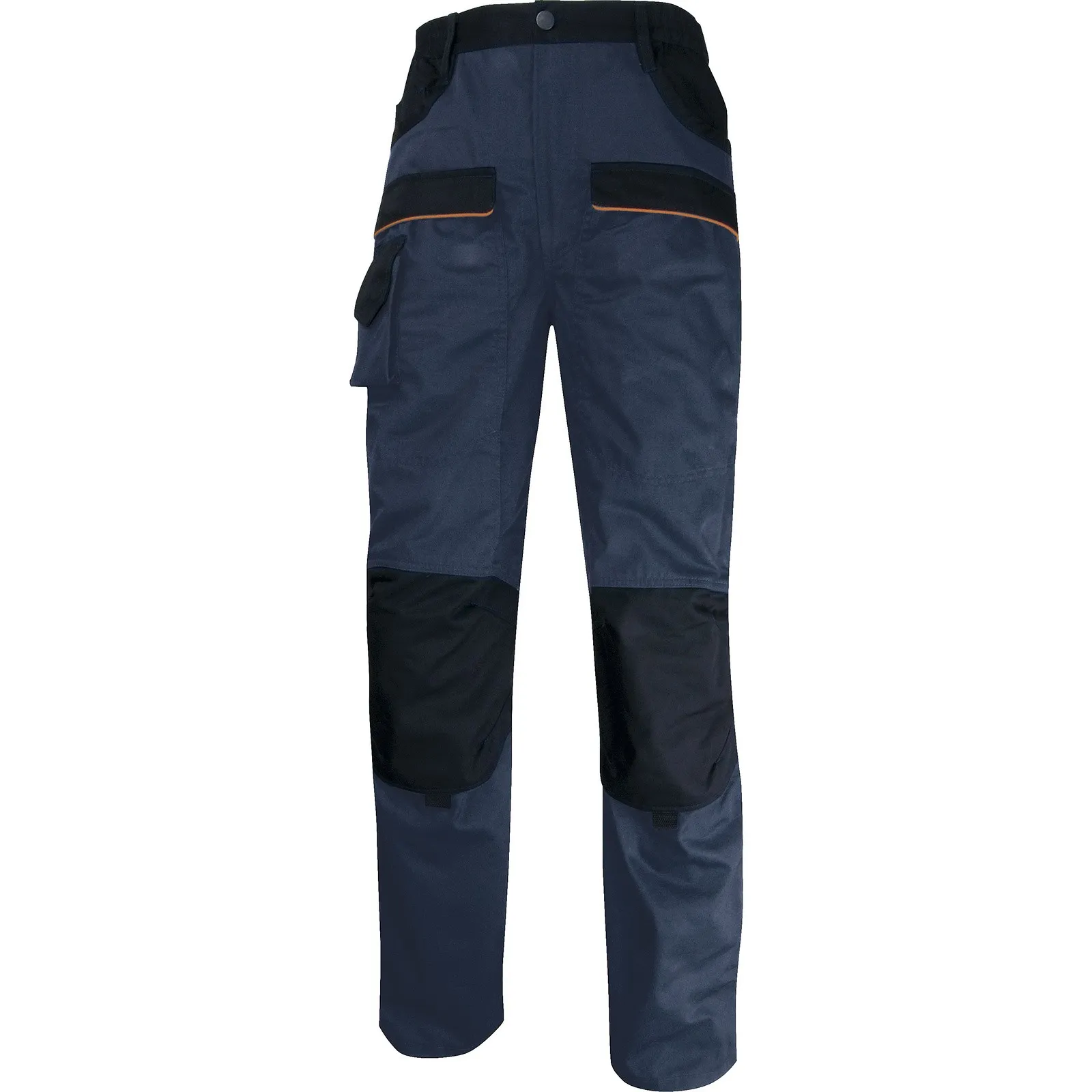 Передняя половинка брюк из двух частей: верхней и нижней. На верхней части – два прорезных боковых кармана с наклонным входом, в правом – дополнительный карман. Ниже расположены два накладных кармана с клапаном, застегивающимся на контактную ленту; на правом кармане -дополнительно накладной карман с клапаном, застегивающимся на контактную ленту. На нижней части - усилительные накладки в области колена в виде кармана для наколенника, застегивающимся на контактную ленту внизу кармана.