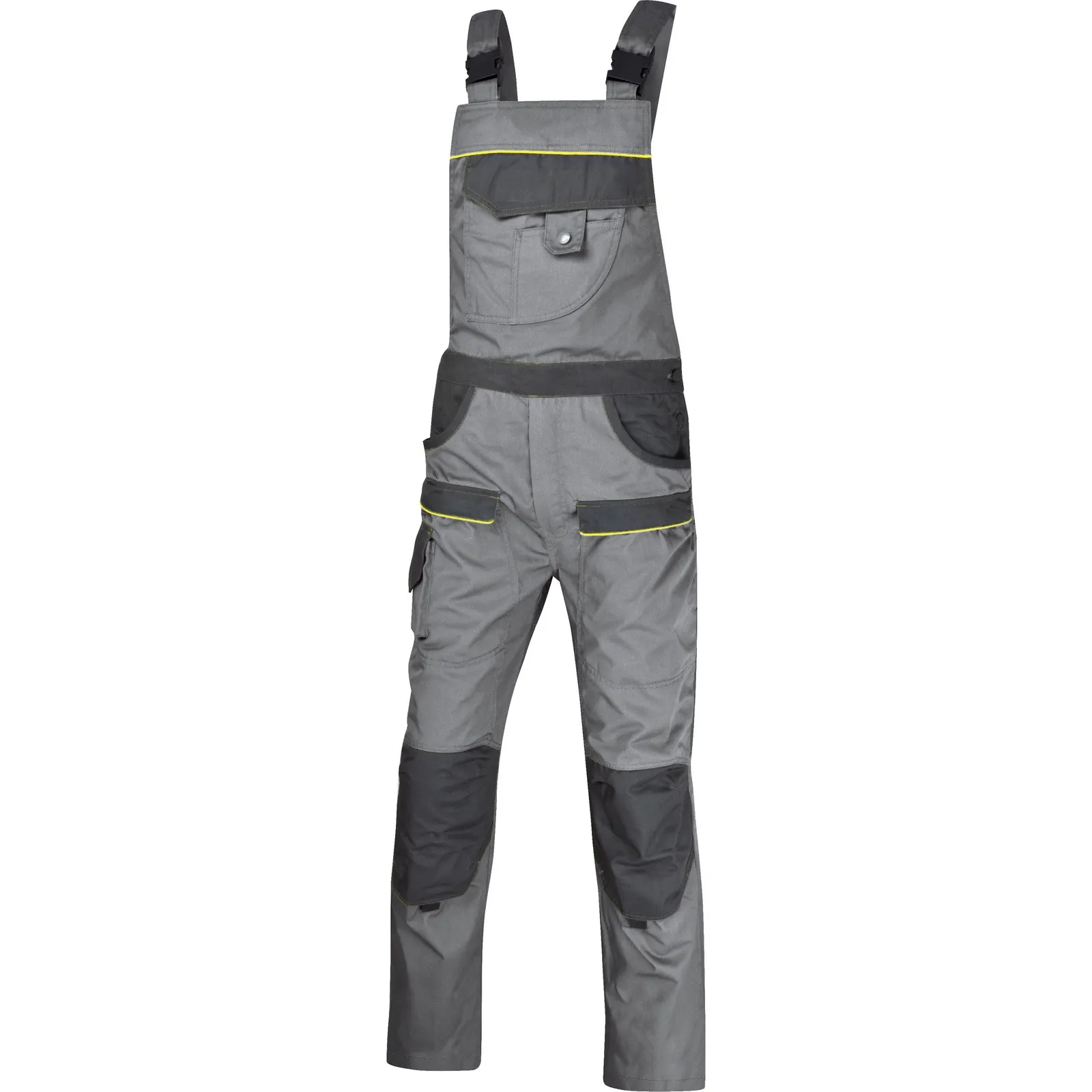 Детали темно-серого цвета: клапана карманов, штанины спереди ниже от колена, нагрудник, карман со шлевками.