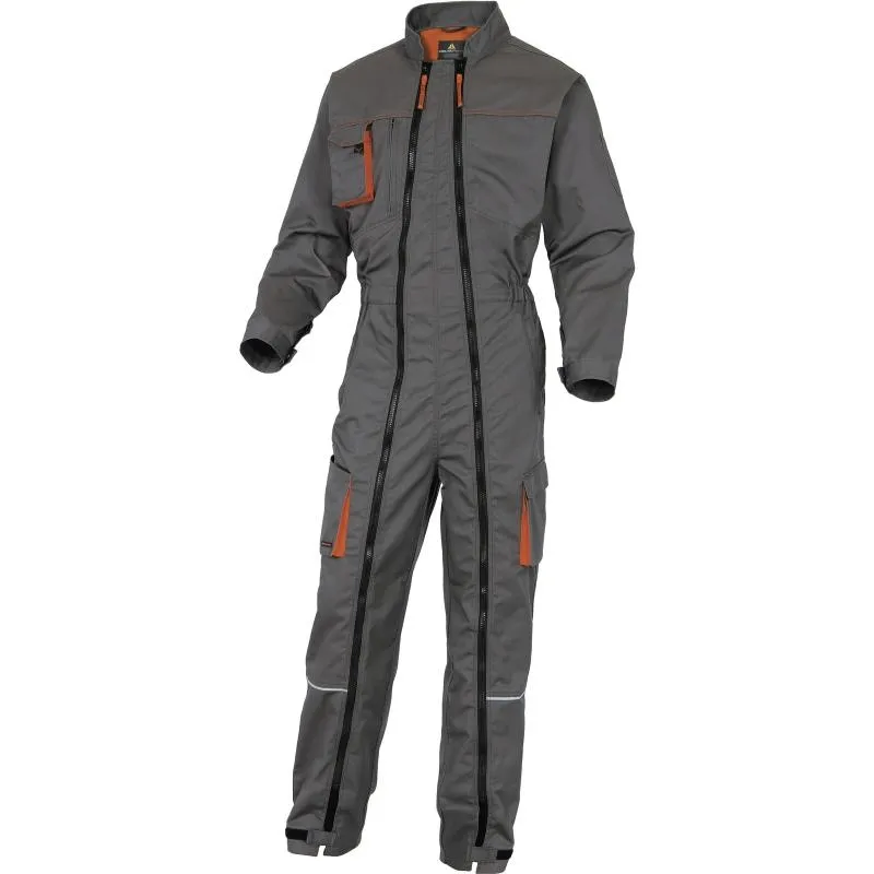 Комбинезон с застегиванием по всей длине на две молнии, с воротником-стойкой. Большое количество накладных и прорезных карманов.