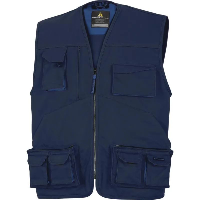 Жилет прямого силуэта, с центральной застежкой-молнией, c V-образной горловиной, с большим количеством накладных и прорезных карманов.