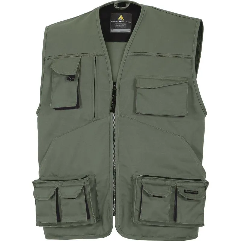 Жилет прямого силуэта, с центральной застежкой-молнией, c V-образной горловиной, с большим количеством накладных и прорезных карманов.