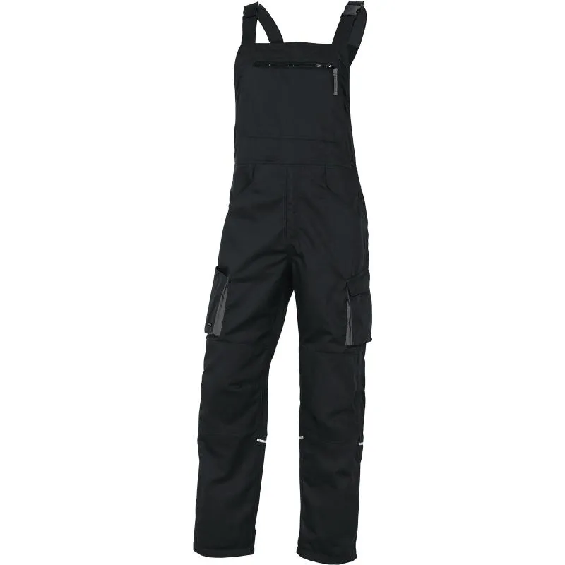 Полукомбинезон прямого силуэта с имитацией пояса с застежкой-молнией в среднем шве передних половинок брюк, с застегиванием на пуговицы по боковым швам, с притачными нагрудником и спинкой на бретелях. Бретели с участком из эластичной ленты, с застежкой-карабином.