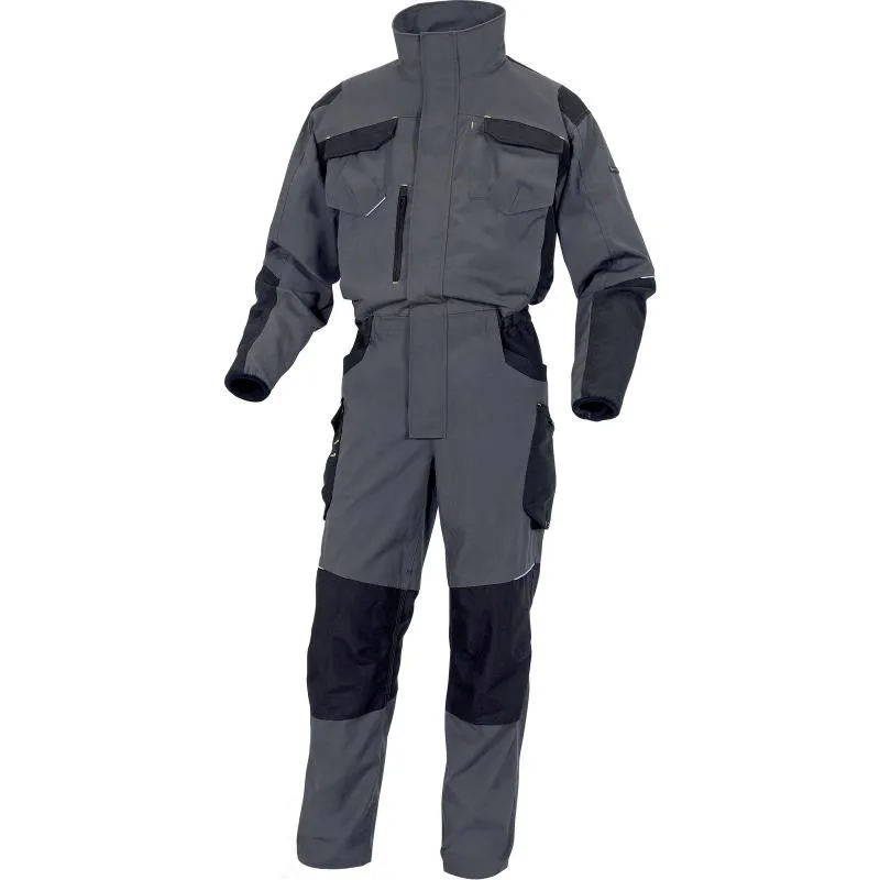 Комбинезон с застежкой на двухстороннюю замок – молнию, с ветрозащитной планкой на контактной ленте, с воротником- стойкой. Большое количество накладных и прорезных карманов.