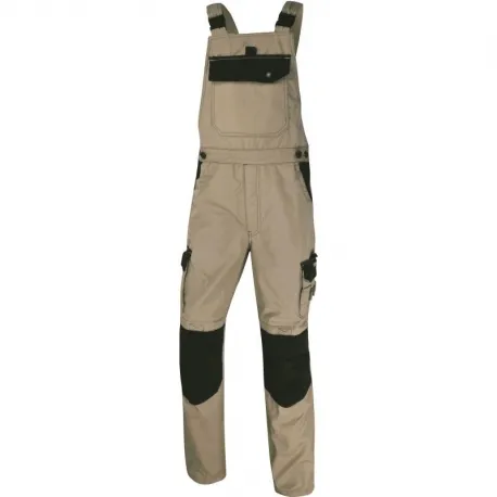 Полукомбинезон на бретелях, с застежкой брюк на молнию, дополнительным застегиванием на пуговицы по бокам. Большое количество накладных и прорезных карманов + 2 съемных кармана. Усилительные накладки в области колена в виде кармана для наколенника.
