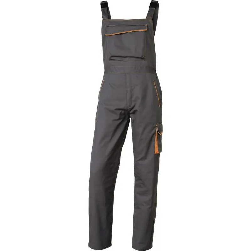 Полукомбинезон на бретелях, с застежкой брюк на молнию, дополнительным застегиванием на пуговицы по бокам. Большое количество накладных и прорезных карманов.