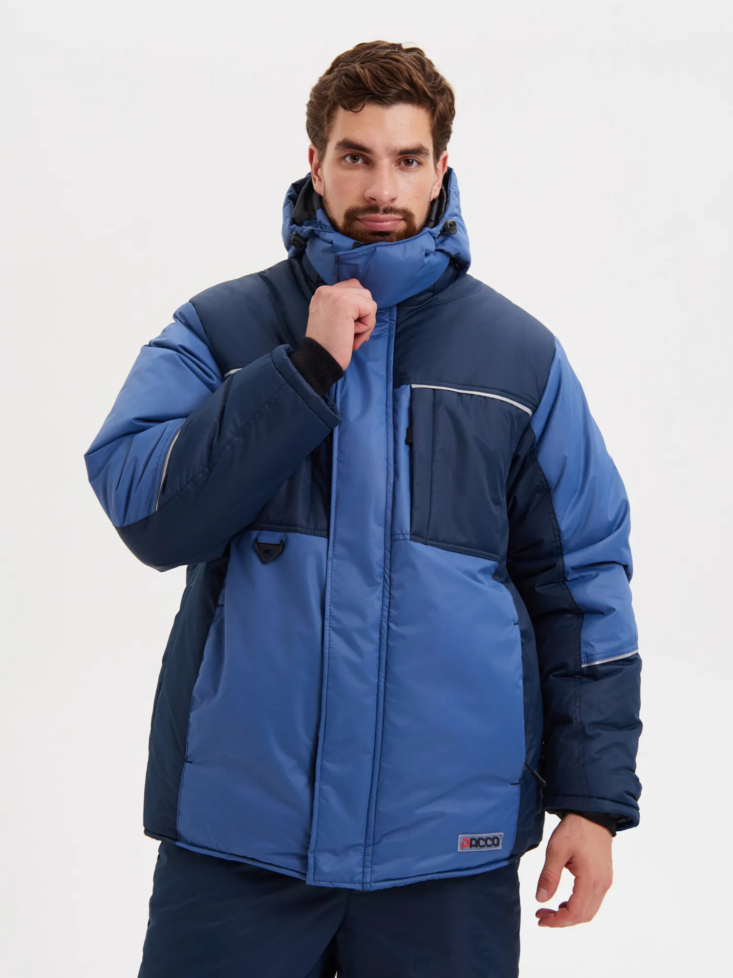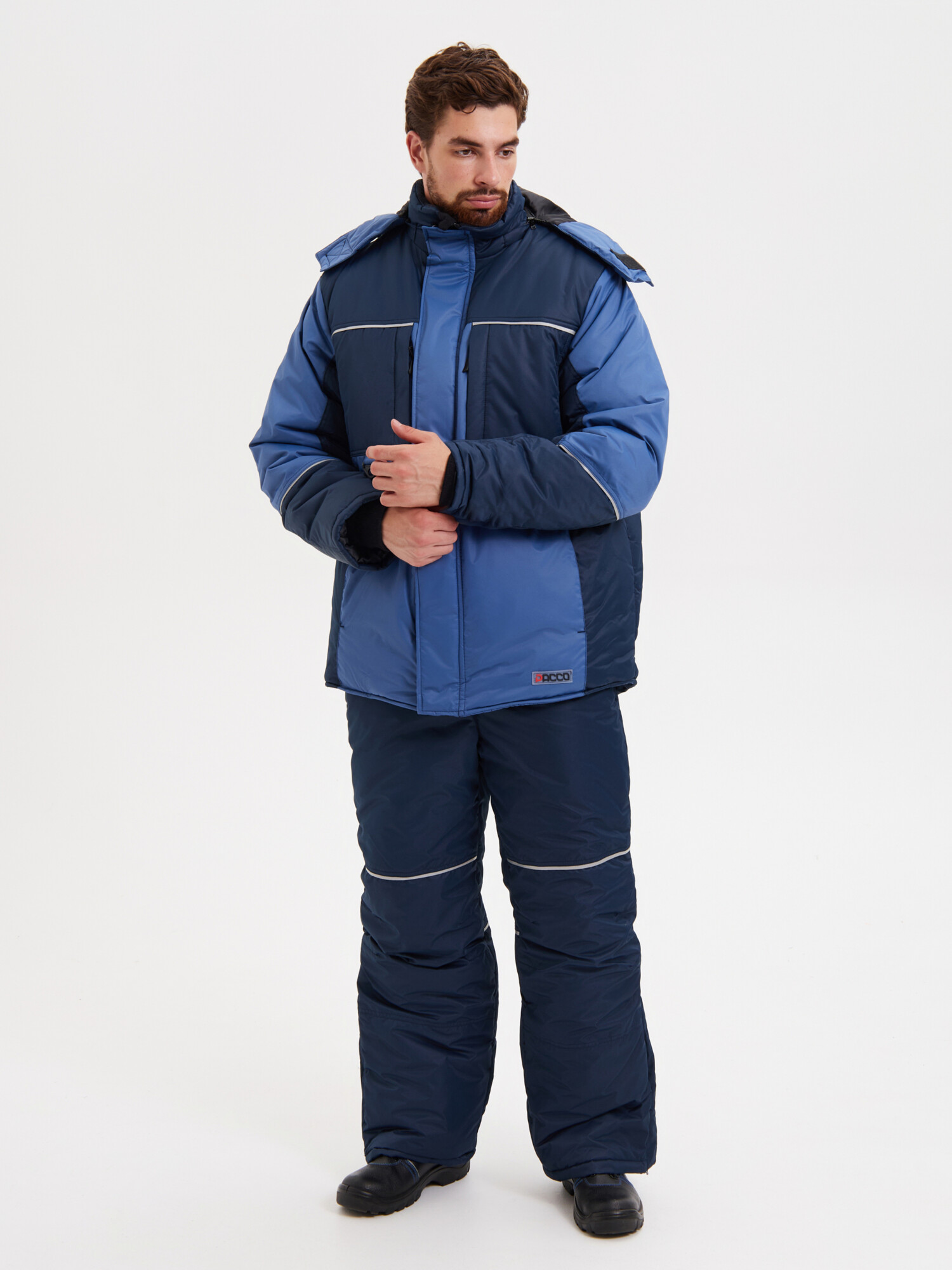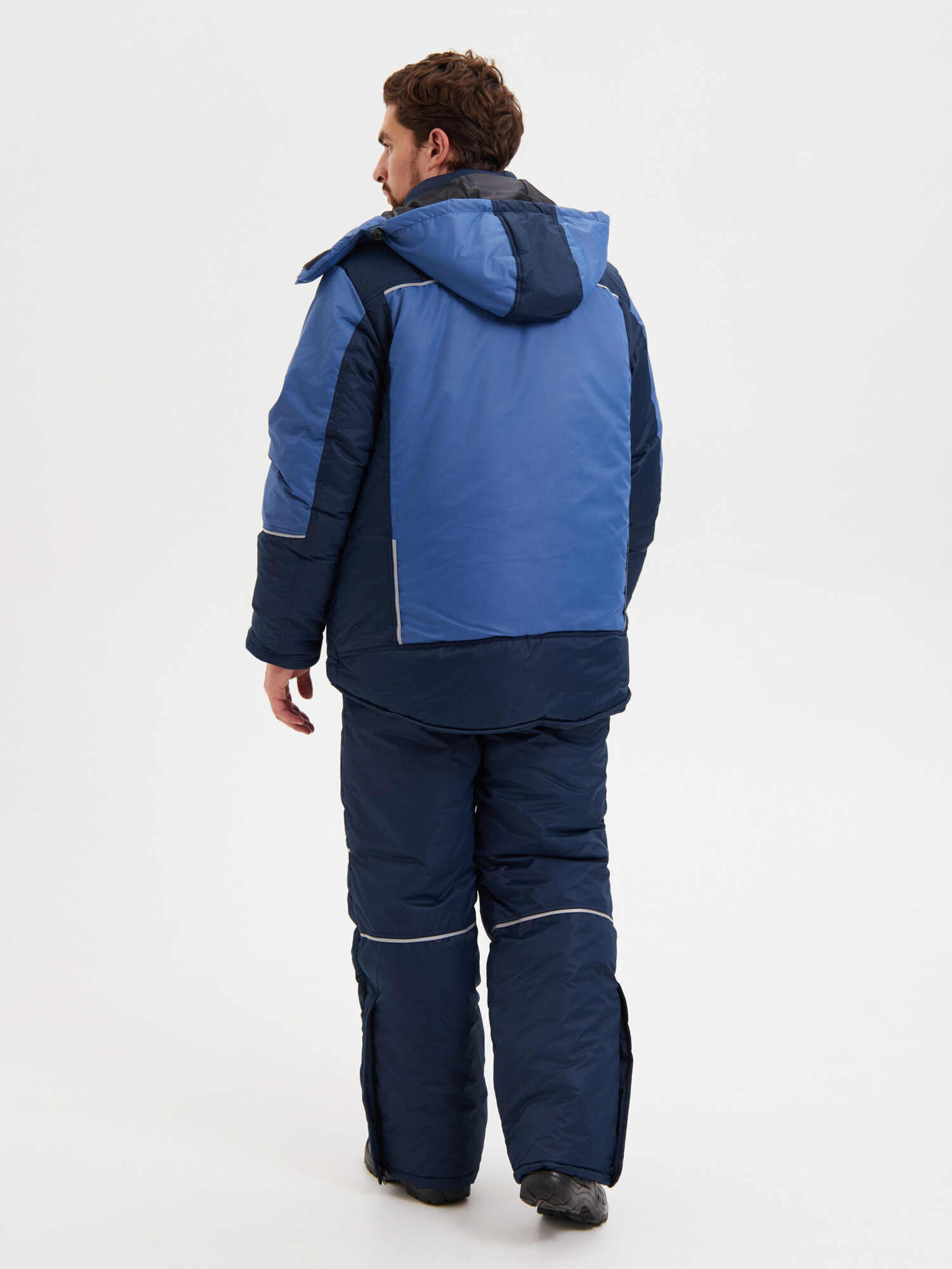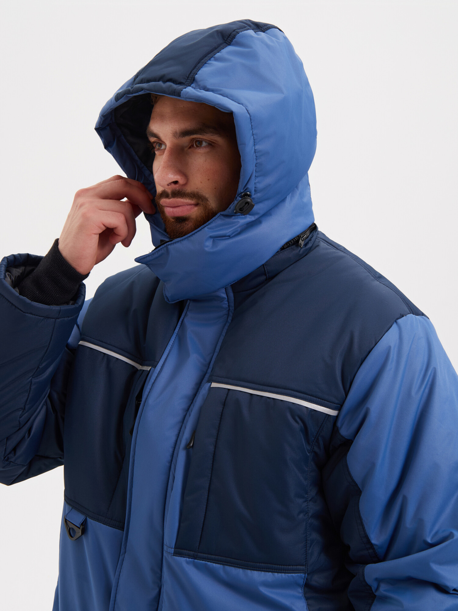 Куртка прямого силуэта с притачной утепленной подкладкой и съёмным капюшоном; центральной бортовой застежкой - «молнию» с ветрозащитной левосторонней планкой, застёгивающейся на 4 кнопки и ленты-липучки. Воротник стойка. Со стороны лица ветрозащитная планка из флиса. Два нагрудных утеплённых кармана с застёжкой – “молнией”. На нижних частях куртки вертикальные карманы в швах с застёжкой – “молнией”. Мешковины карманов из флиса. На правом нагрудном кармане располо- жен держатель для бейджа. Спинка удлинённой нижней частью. Подкладка куртки притачная утеплённая. Центральная и средняя часть спинки из флиса. Для улучшения гигроскопичности в областях подмышечных впадин и центральной нижней части спинки расположена сетка Аir-mesh. Левая полочка с прорезным карманом на застёж- ку – “молнию”. По линии талии спинки кулиса со шнуром эластичным продетым через люверсы и держатели для регулировки ширины изделия. Внутри куртки ниже линии талии - ветрозащитный пояс на резинке.