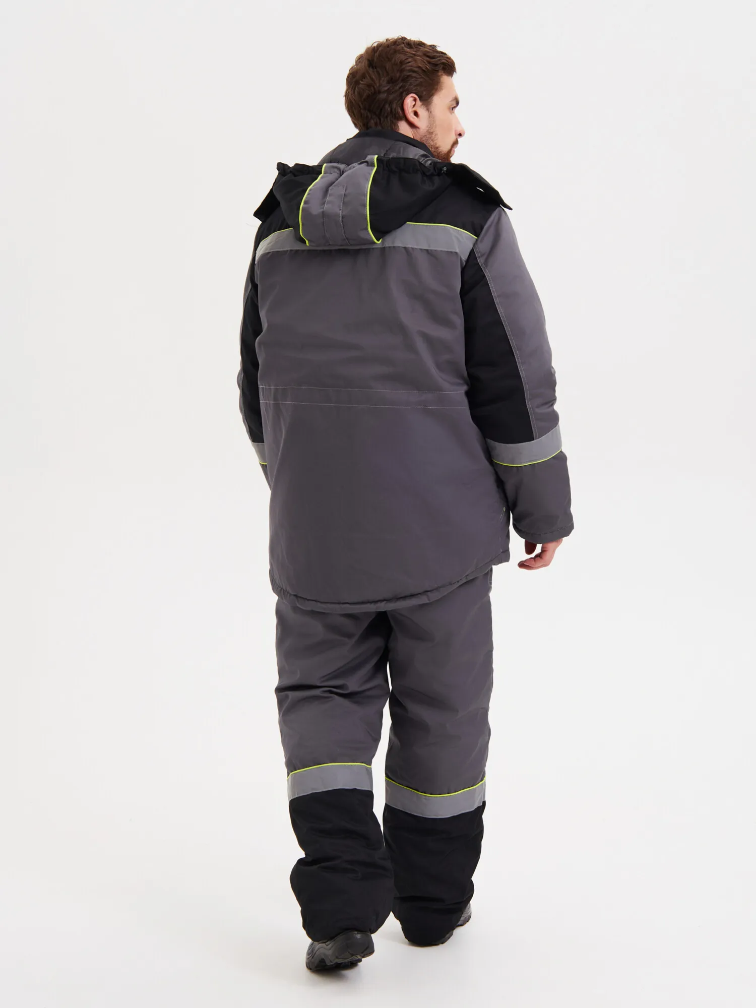 Костюм состоит из куртки и полукомбинезона. Подкладка костюма усилена ветрозащитной тканью. Куртка с центральной застежкой – “молнией”, закрытой ветрозащитной планкой на липучках. Нагрудные карманы закрыты клапаном на липучках. Объёмные нижние накладные карманы с клапанами на липучках. Под левым нагрудным карманом полукольцо для крепления пропуска. Рукава с манжетами из мягкого трикотажа. Воротник утепленный на подкладке из флиса. Капюшон съемный, на молнии, с регулировкой объема. Спинка с удлиненным низом. Внутри куртки карман для телефона и небольших документов. По талии куртки кулиса для регулировки. Полукомбинезон с центральной застежкой на двухзамковую молнию. Бретели из эластичной резинки с регулировкой длины и с застежкой - фастекс. Спереди объемные накладные карманы с боковым входом. На спинке - эластичная тесьма для регулировки объема по талии. На кокетках спереди и спинке куртки, по низу рукавов, по низу брюк полукомбинезона расположен СОП шириной 50мм и канты контрастного цвета.