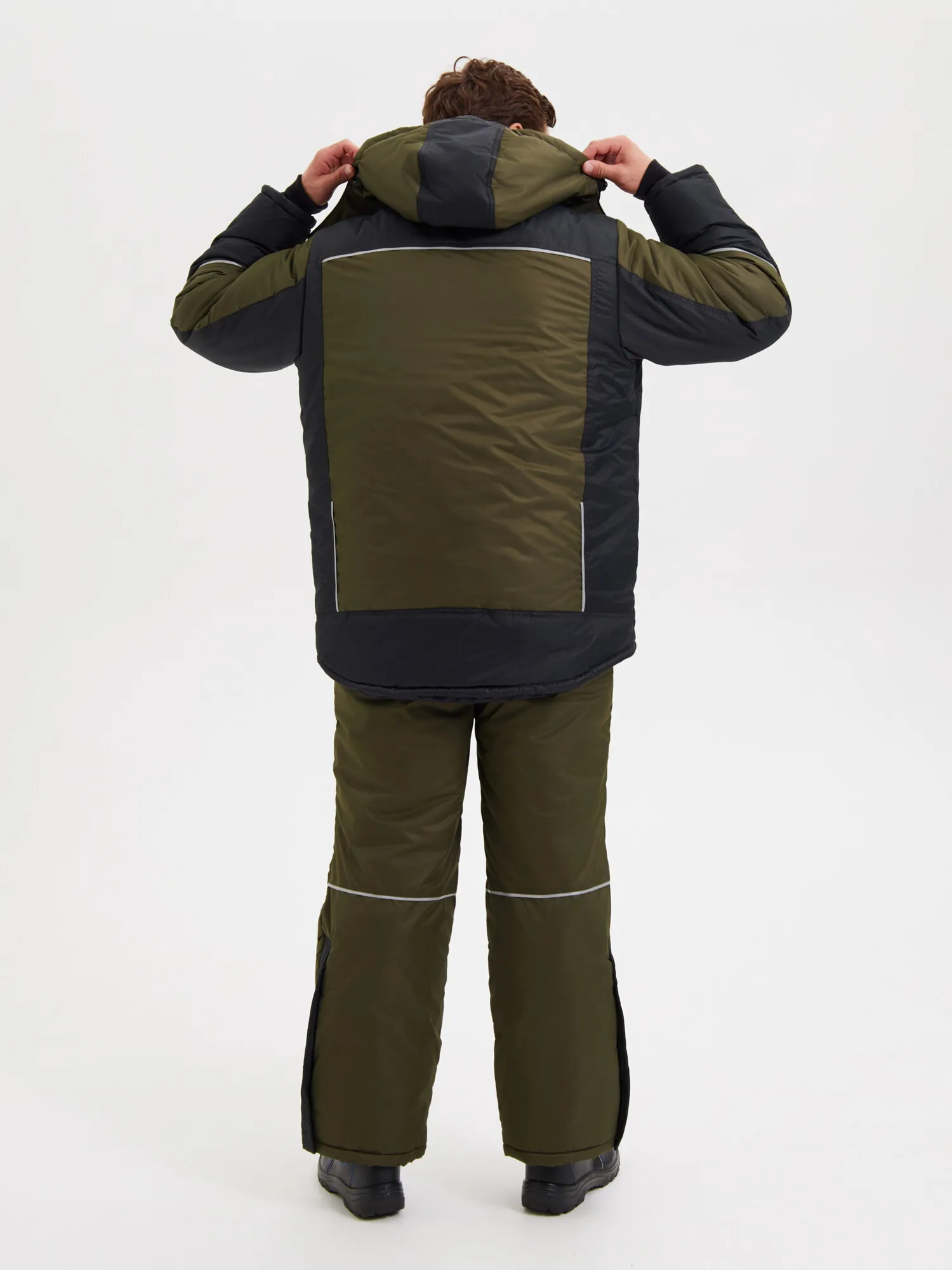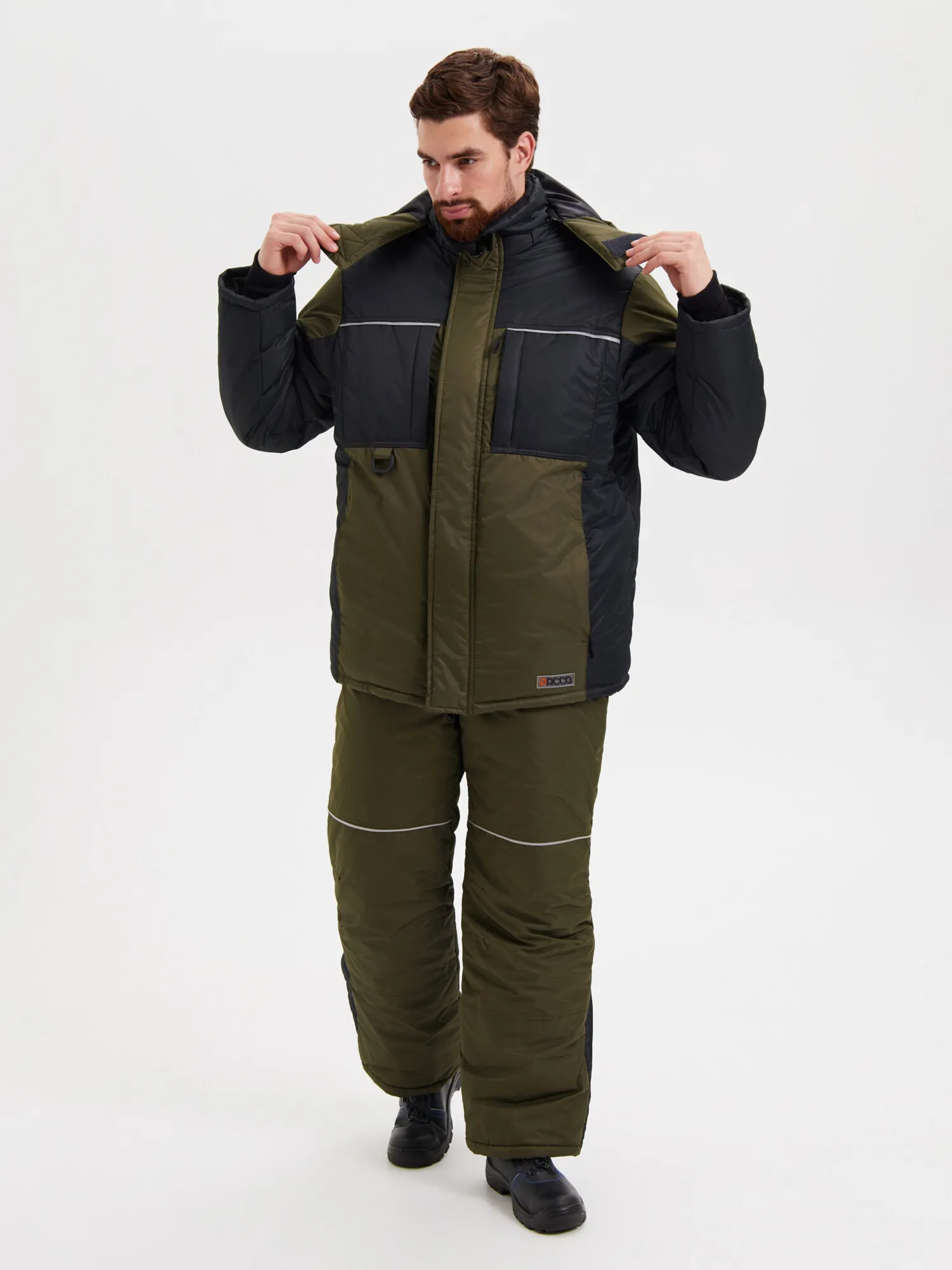 Куртка прямого силуэта с притачной утепленной подкладкой и съёмным капюшоном; центральной бортовой застежкой - «молнию» с ветрозащитной левосторонней планкой, застёгивающейся на 4 кнопки и ленты-липучки. Воротник стойка. Со стороны лица ветрозащитная планка из флиса. Два нагрудных утеплённых кармана с застёжкой – “молнией”. На нижних частях куртки вертикальные карманы в швах с застёжкой – “молнией”. Мешковины карманов из флиса. На правом нагрудном кармане располо- жен держатель для бейджа. Спинка удлинённой нижней частью. Подкладка куртки притачная утеплённая. Центральная и средняя часть спинки из флиса. Для улучшения гигроскопичности в областях подмышечных впадин и центральной нижней части спинки расположена сетка Аir-mesh. Левая полочка с прорезным карманом на застёж- ку – “молнию”. По линии талии спинки кулиса со шнуром эластичным продетым через люверсы и держатели для регулировки ширины изделия. Внутри куртки ниже линии талии - ветрозащитный пояс на резинке.