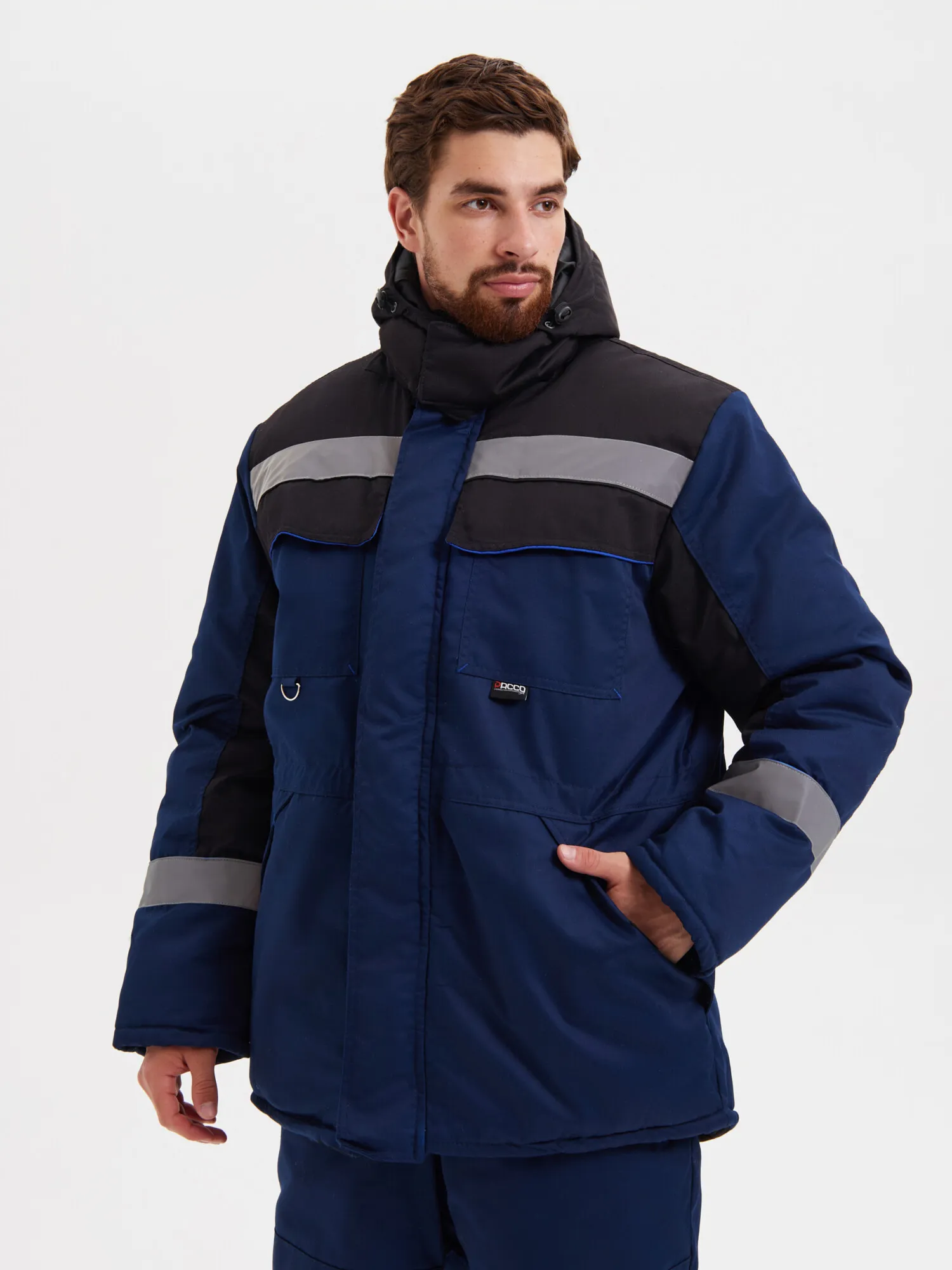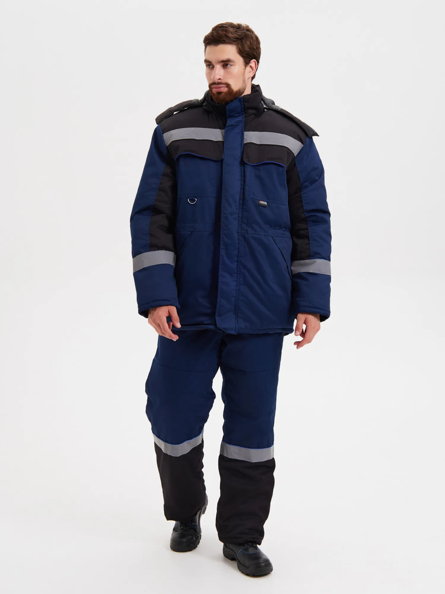 Костюм состоит из куртки и полукомбинезона. Подкладка костюма усилена ветрозащитной тканью. Куртка с центральной застежкой – “молнией”, закрытой ветрозащитной планкой на липучках. Нагрудные карманы закрыты клапаном на липучках. Объёмные нижние накладные карманы с клапанами на липучках. Под левым нагрудным карманом полукольцо для крепления пропуска. Рукава с манжетами из мягкого трикотажа. Воротник утепленный на подкладке из флиса. Капюшон съемный, на молнии, с регулировкой объема. Спинка с удлиненным низом. Внутри куртки карман для телефона и небольших документов. По талии куртки кулиса для регулировки. Полукомбинезон с центральной застежкой на двухзамковую молнию. Бретели из эластичной резинки с регулировкой длины и с застежкой - фастекс. Спереди объемные накладные карманы с боковым входом. На спинке - эластичная тесьма для регулировки объема по талии. На кокетках спереди и спинке куртки, по низу рукавов, по низу брюк полукомбинезона расположен СОП шириной 50мм и канты контрастного цвета.