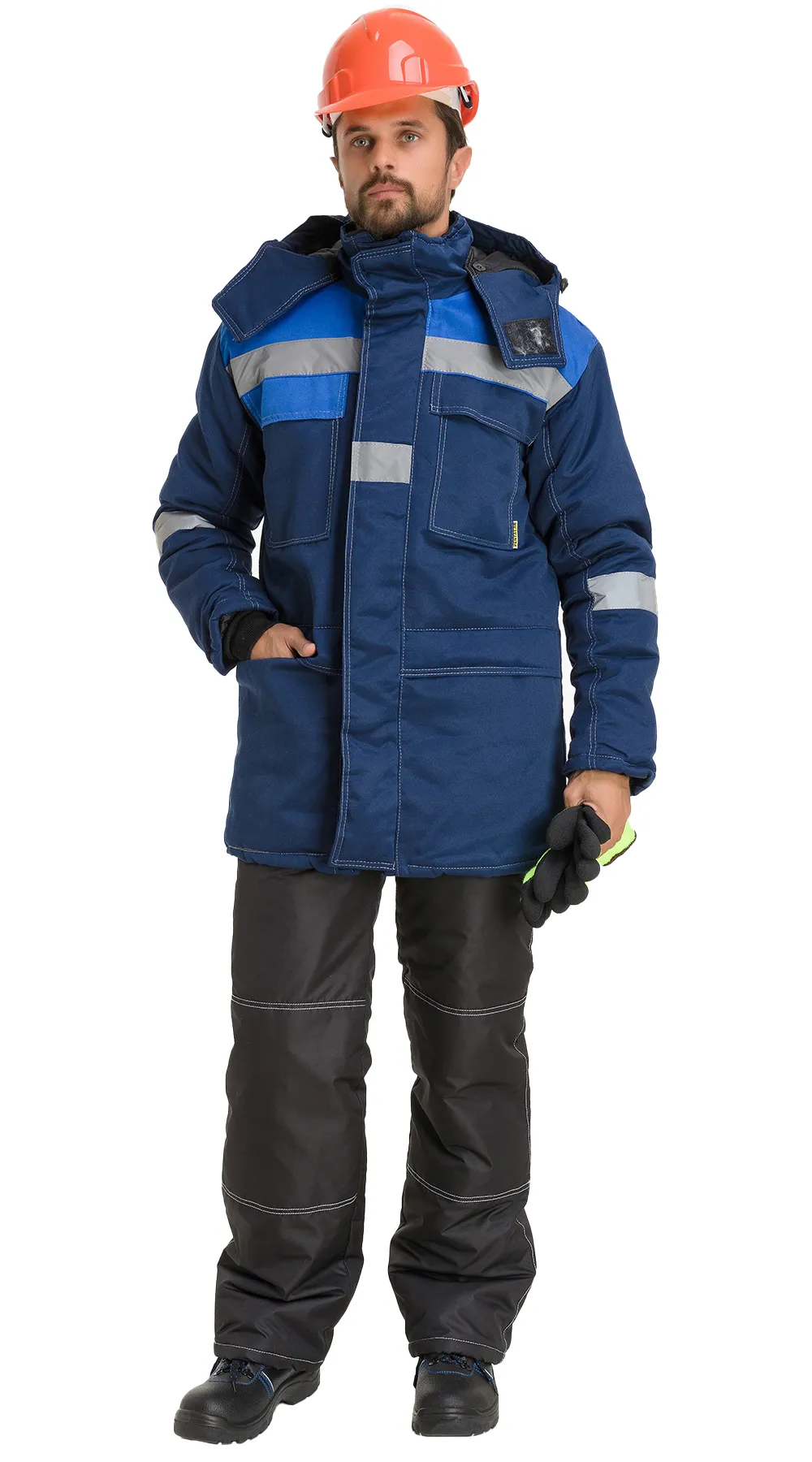 Удлиненная куртка с центральной застежкой на двухзамковую молнию и ветрозащитной планкой на пуговицах. Накладные карманы с клапанами на пуговицах. Рукава куртки с внутренними трикотажными манжетами для дополнительной теплозащиты. Утепленный капюшон, регулируемый по объему и воротник, отделанный флисом с внутренней стороны. Светоотражающие полосы на рукавах, по линии груди и спины. По линии талии куртки кулиса, регулируется резинкой-шнуром с фиксаторами. Цвет изделия —темно-синий с васильком. Куртка выполнена из прочной смесовой ткани с водоотталкивающими свойствами.Цвет: темно-синий с васильковой отделкой.