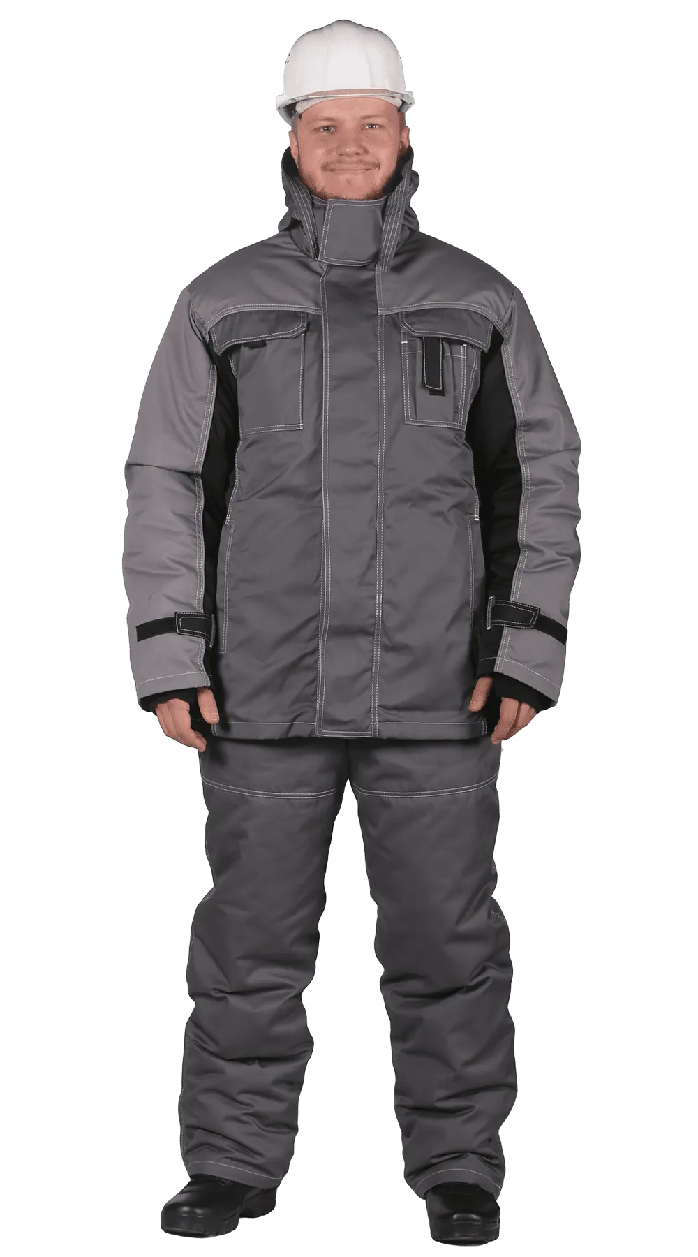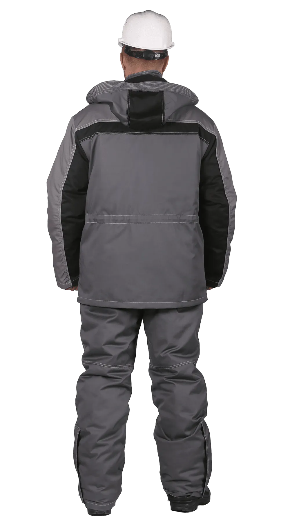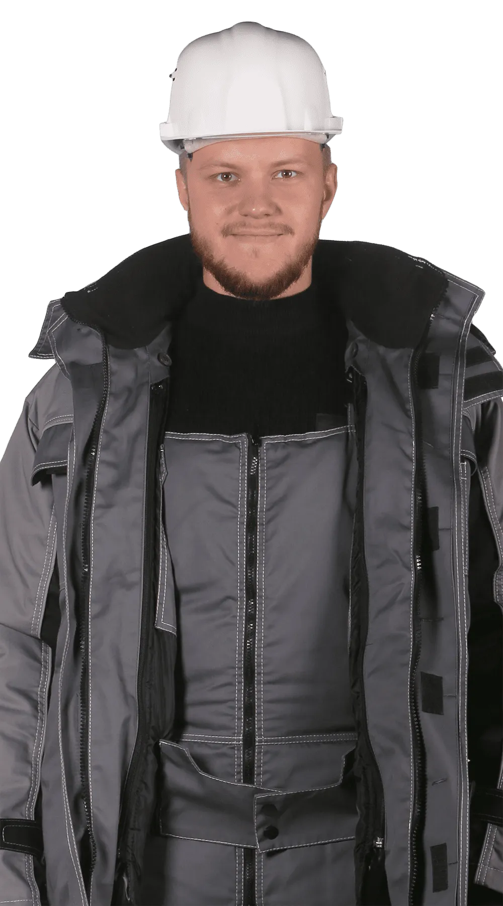 Куртка выполнена из прочной и плотной ткани TC TWILL, прошита сверхпрочными толстыми (70АП) нитками контрастного светло-серого цвета с армированным сердечником. Центральная супатная застежка на усиленную морозостойкую двухзамковую молнию, контактную ленту и пуговицы, втачные рукава, воротник-стойка и пристегивающийся на молнию капюшон отделаны с внутренней части флисом. Рукава с напульсниками из флиса и ветрозащитными манжетами, объем по рукавам регулируется патами. По линии талии обьем регулируется кулисой. Куртка оснащена двумя боковыми внутренними и двумя нагрудными накладными многофункциональными карманами. Вход в боковой карман расположен в шве соединения частей полочки и закрывается на морозостойкую молнию. Под ветрозащитным клапаном – потайной карман с молнией (для документов формата А4). Утепленная подстежка пристегивается на молнии и пуговицы, оснащена ветрозащитной юбкой, двумя внутренними накладными карманами. Внешний слой утепленной подстежки выполнен из ветрозащитной ткани, обеспечивающей не продуваемость изделия в сильный ветер при низких температурах, комфортный микроклимат под одеждой и исключает миграцию утеплителя.