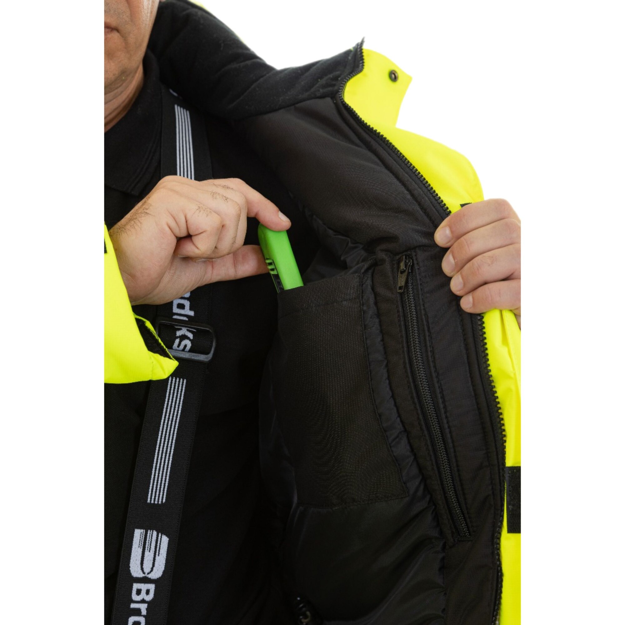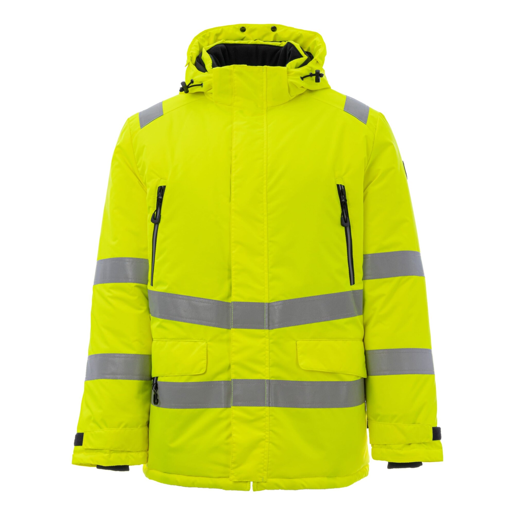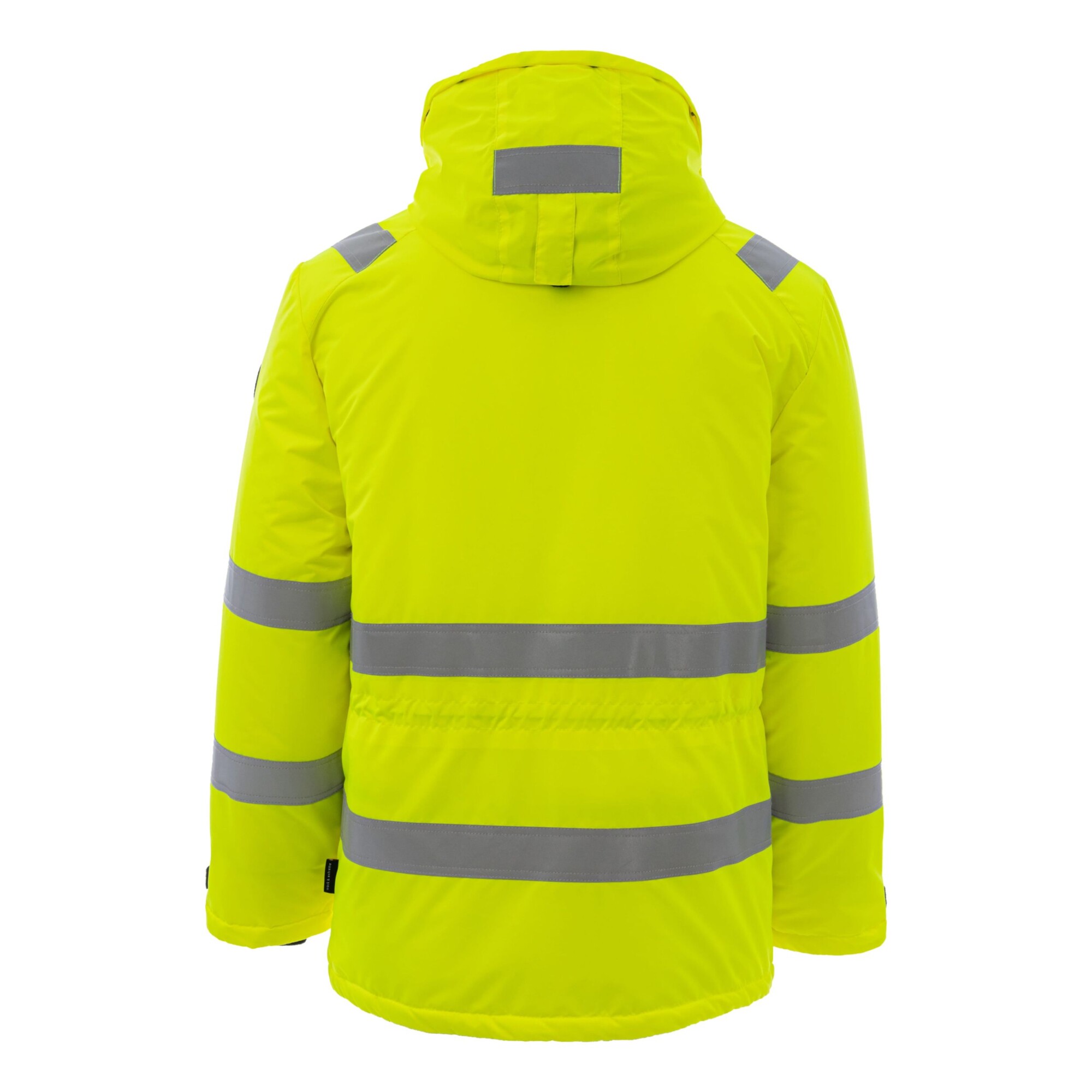 Зимняя сигнальная куртка-парка BRODEKS KW220, желтый/черный - зимняя парка жёлтого флуоресцентного цвета со светоотражающими лентами. Сшита из прочной мембранной ткани рипстоп. Обеспечивает надёжную защиту от ветра и осадков и хорошо отводит влагу. Куртка прочная на разрыв, устойчива к механическим повреждениям