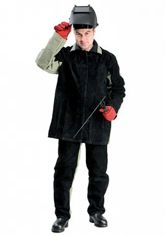 Костюм сварщика с накладками из спилка на полочках,боковых частях полочек,верхних частях рукавов,кокетке спинки,передних половинок брюк.Куртка прямого силуэта с потайной бортовой застёжкой из брезента,на пять пуговиц.Спинка со швом,кокеткой,вентиляционными отверстиями по линии настрачивания,со стоячим отложным воротником,на стойку которого настрочена накладка из х/б ткани,с двумя внутренними карманами,которые находятся в отрезных бочках полочек.Рукава втачные,двухшовные по низу напульсники.В боковом шве куртки под рукавами вентиляционные отверстия.В куртке на полочках,верхней части рукавов и боковой части полочки усиление из спилка.Под спилком-бязь.