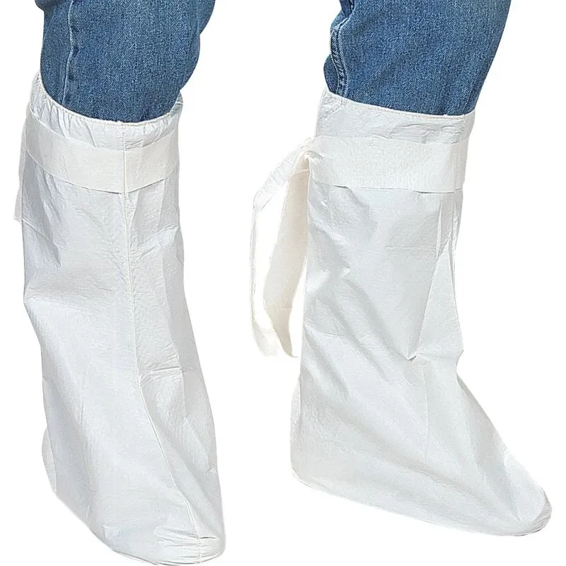 Сапоги-бахилы краткосрочного применения. Нетканый микропористый и ламинированный материал. Эластичная резинка сверху бахил и затягивающие ремешки на голени. В упаковке – 10 пар