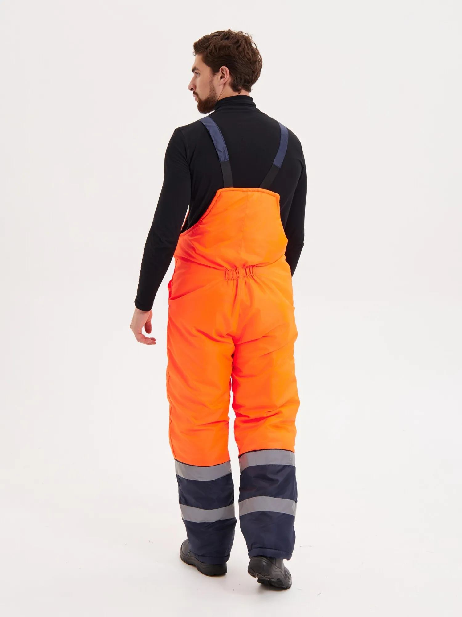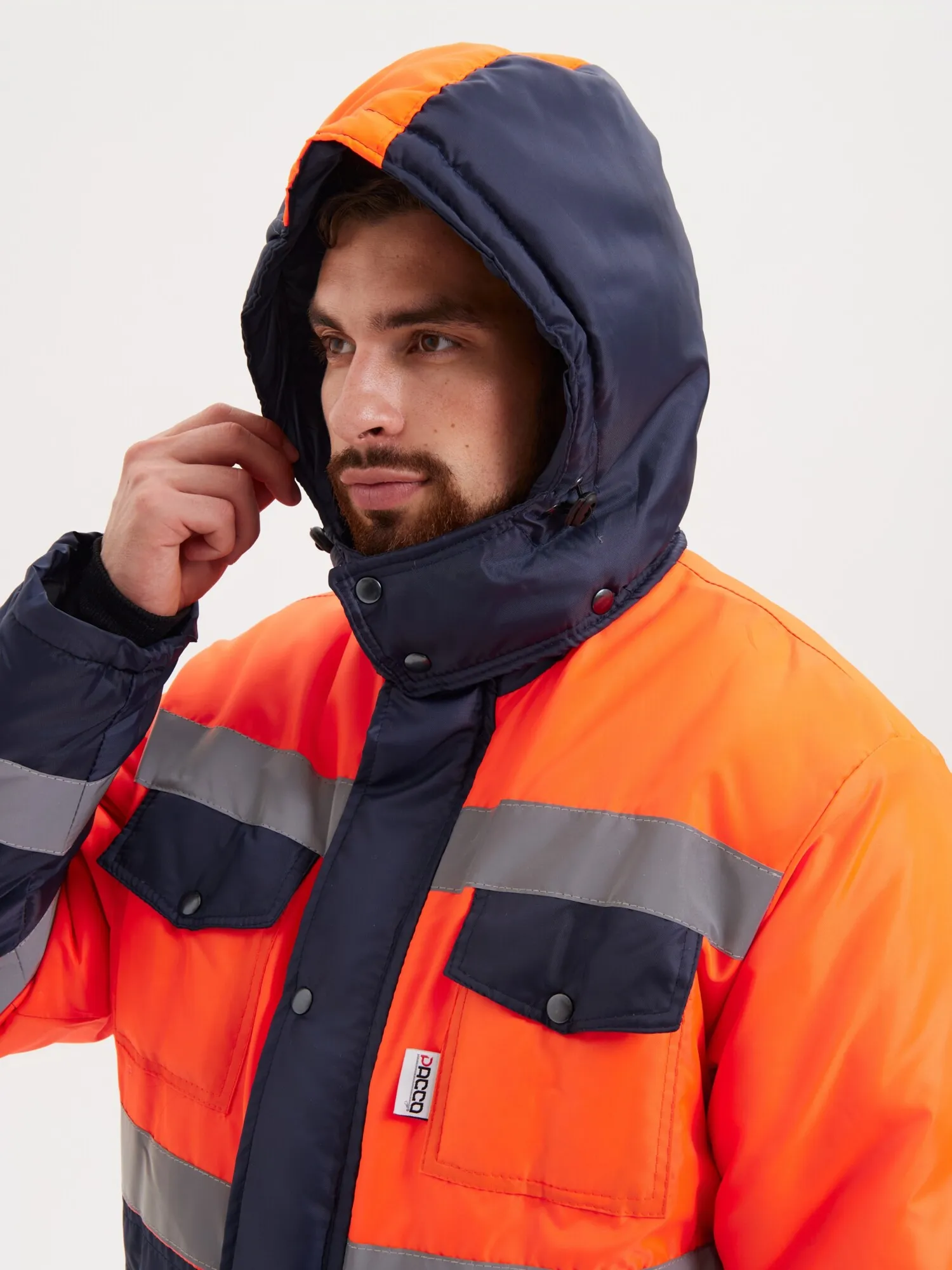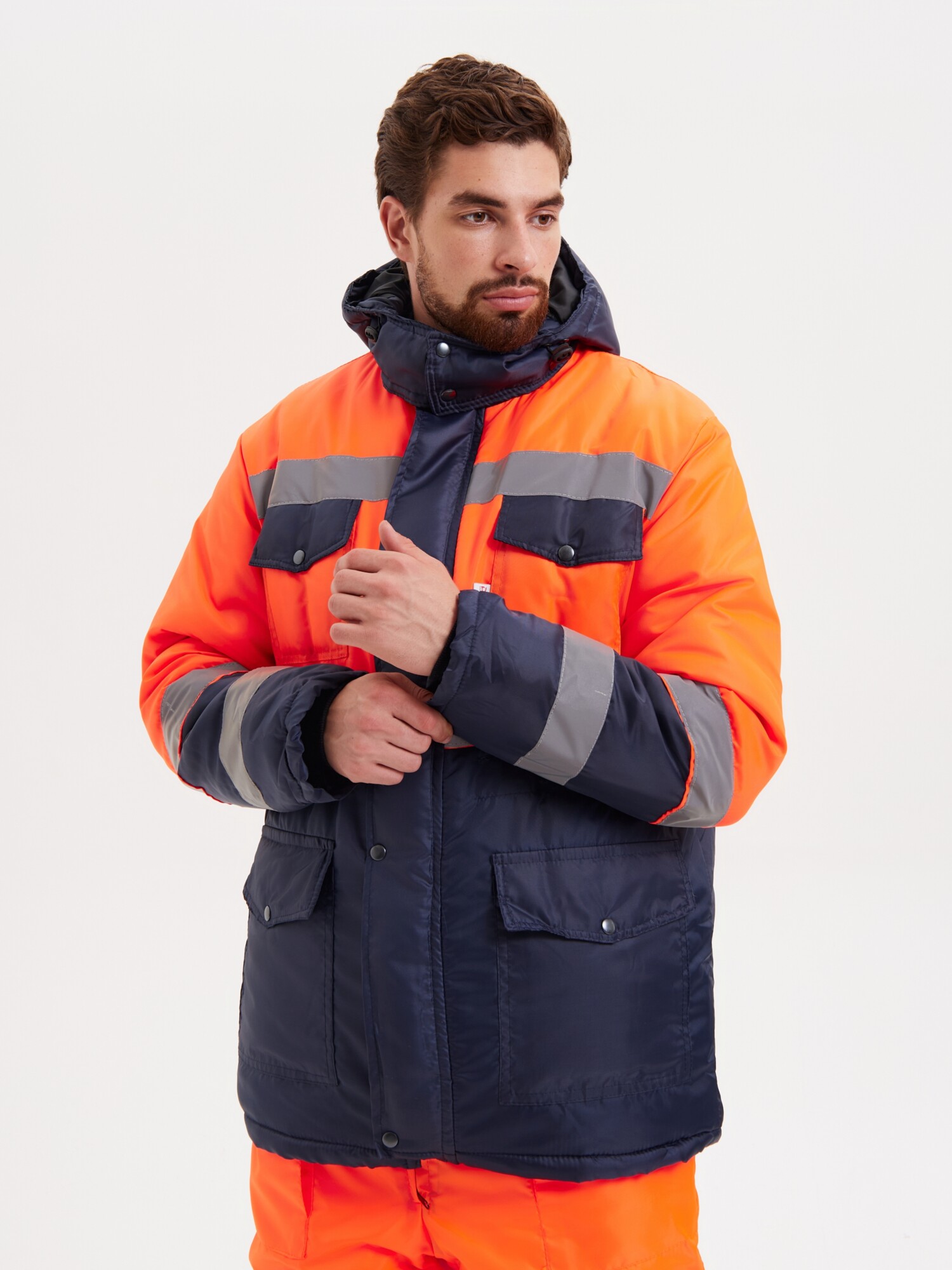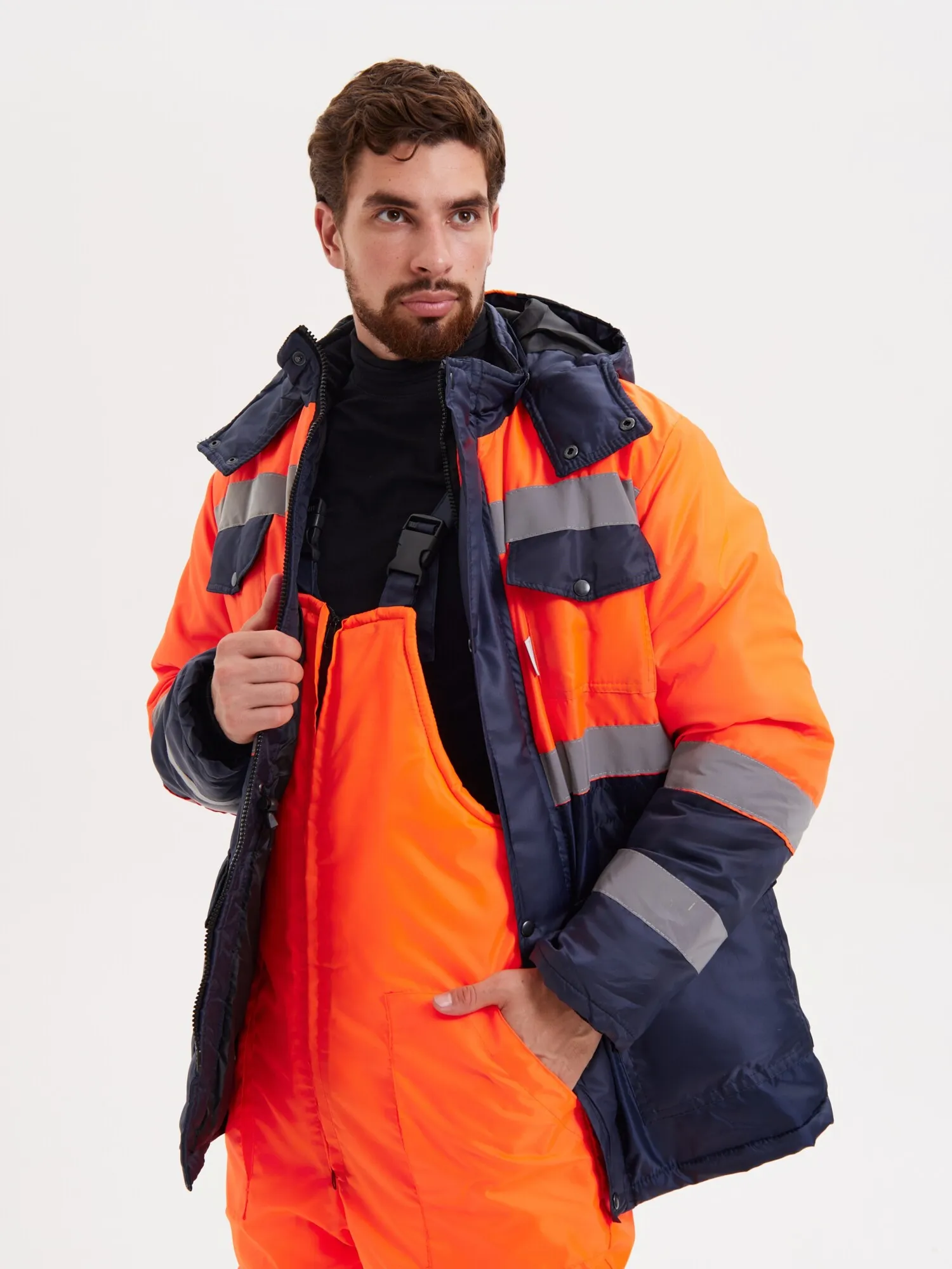 Куртка прямого силуэта с притачной утепленной подкладкой, центральной бортовой застежкой на тесьму молнию с ветрозащитной левосторонней планкой, застёгивающейся на кнопки. Куртка с втачными рукавами, с воротником – стойкой и капюшоном. Внутренний воротник из флиса. На куртке имеются накладные карманы с клапанами: два нагрудных и два нижних. Полукомбинезон прямого силуэта с двумя накладными карманами на притачной подкладке с центральной застёжкой - «молнией» и регулируемыми бретелями с застежкой на фастексы. Световозвращающая лента шириной 50 мм проходит по линии кокетки на полочках и спинке, низу куртки, средней части рукавов, и двойные в нижней части полукомбинезона, что соответствует III классу защиты сигнальной одежды.
