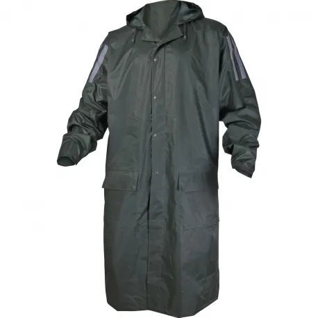 Плащ влагозащитный. Пропаянные швы. Втачной капюшон. Ветрозащитная планка на кнопках. Рукава-реглан. Внутренние манжеты в рукавах. 2 накладных кармана с клапанами. Клапан на спине для воздухообмена. Отверстия для воздухообмена в области подмышек. Светоотражающие декоративные полосы на рукавах и спине.