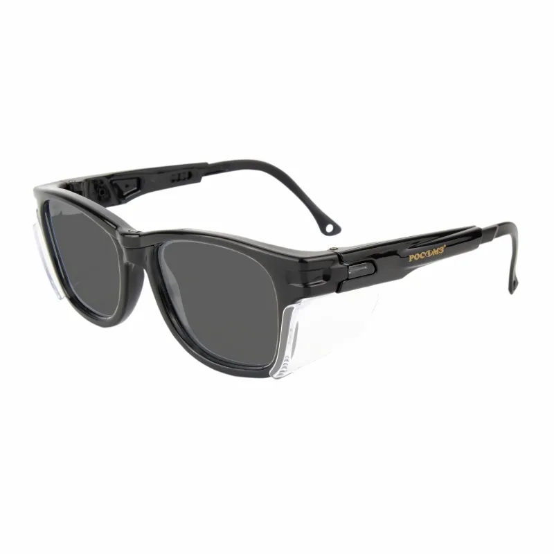 Очки универсального применения с широкой боковой защитой, вентиляционными отверстиями и регулируемым по длине заушником.