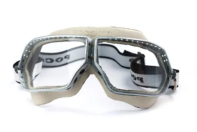 Очки с упрочненными минеральными стеклами сферической формы в жестком металлическом держателе в мягком корпусе из резины, покрытым стойкой и гигиеничной тканью, с регулируемой наголовной лентой.