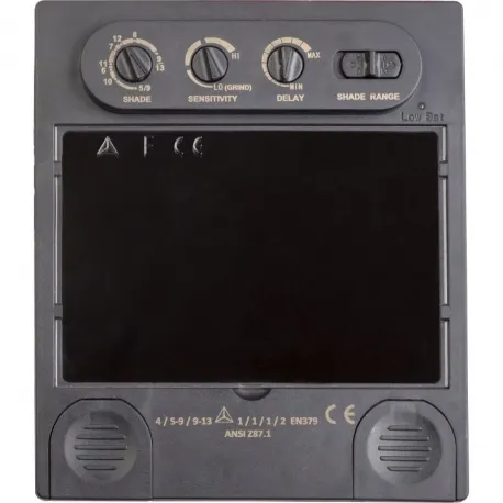 Размер светофильтра: 100х67 мм. Оптический класс - 1 (высший); класс рассеяния света -1; коэффициент пропускания света – 1; угловая зависимость коэффициента пропускания света-2. Светофильтр позволяет настраивать три параметра: чувствительность, степень затемнения и время срабатывания фильтра. Чувствительность регулируется в зависимости от уровня освещённости при различных способах сварки (LOW-HI). Степень затемнения разделена на две группы: DIN5 – DIN9 и DIN9 – DIN13, в осветленном состоянии – DIN4. Время затемнения – 0,00004 с, время осветления – от 0,15 до 0,8 с. На светофильтре расположены 4 оптических датчика. Светофильтр работает от двух литиевых батарей, имеется индикатор разряда батареи.