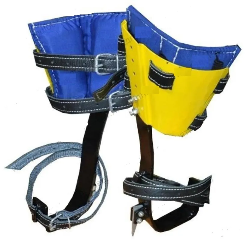 Состав: Стальное основание с супортом, комплект шипов для деревьев с толстой и тонкой корой. Толстый кушак. Набор ремней для крепления ступни к основанию лазов и кушака к голени пользователя. Стальной, регулируемый по высоте пад. Комплект крепежных элементов – гаек и винтов.