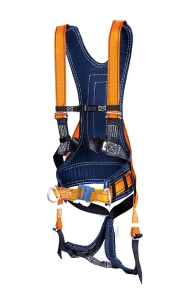 Два элемента крепления для страховки: один со стороны спины (D-кольцо), второй – со стороны груди (две петли, соединяемые резьбовым карабином), и два элемента крепления на поясном ремне, предназначенные для рабочего позиционирования.