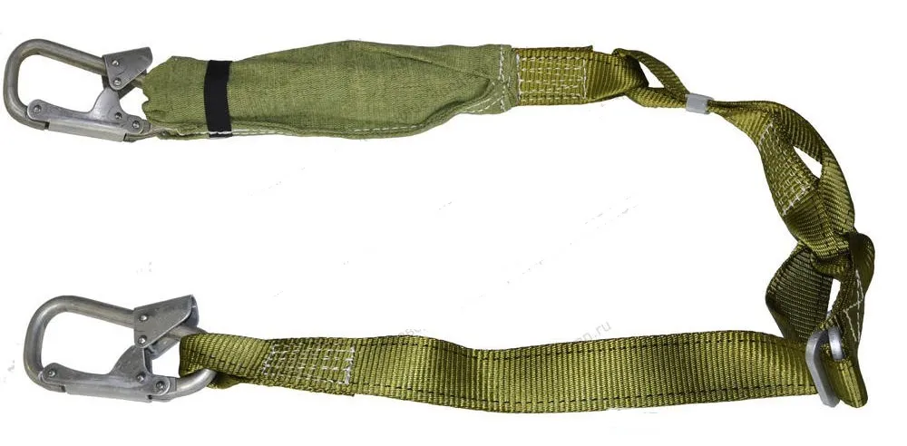 Длина стропа с амортизатором – не более 2 м, регулирование осуществляется перемещением регулировочного элемента, состоящего из 2-х овальных колец, вдоль фала стропа. Строп оснащён двумя антистатическими карабинами типа К4, один из которых, предназначенный для присоединения к анкерной точке конструкции, установлен в петле стропа; а другой, служащий для присоединения к крепежным элементам привязи, в петле амортизатора. Размер зева карабина К4 — 20 мм, зев закрывается и фиксируются от открывания автоматически.