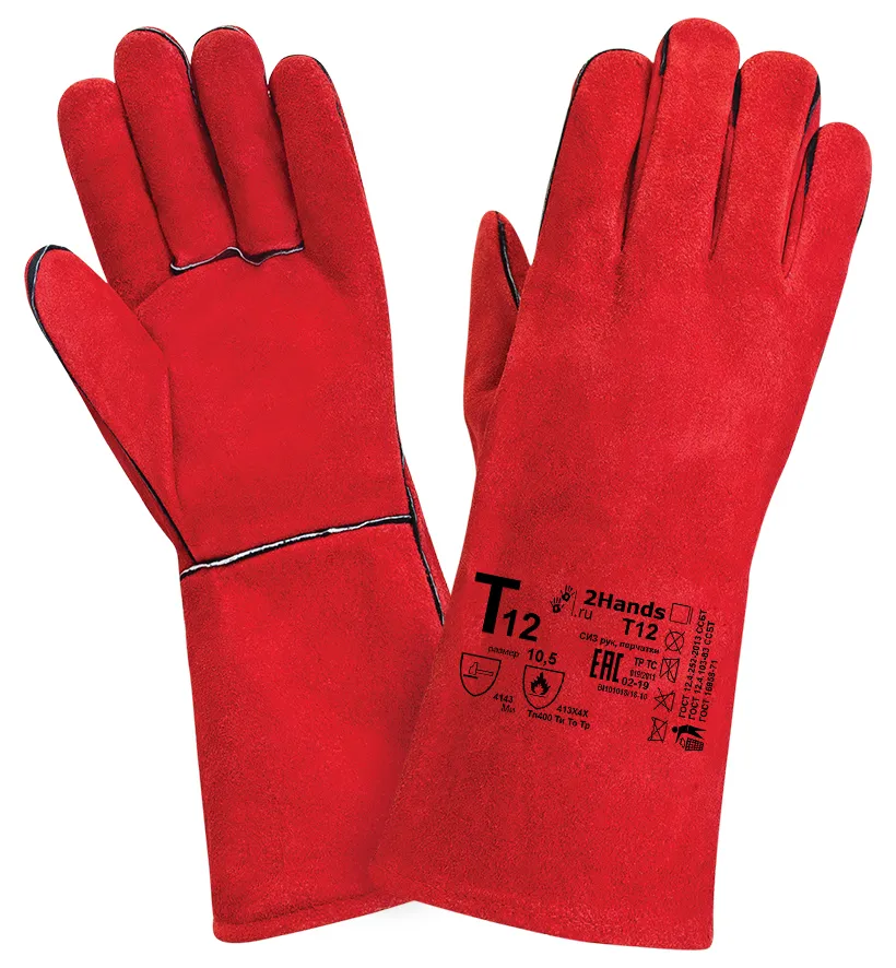 Перчатки сварщика (краги) 2Hands (Ту Хэндс) спилковые для защиты от механических воздействий и повышенных температур. Перчатки пятипалые с подкладкой из флиса на ладони, хлопка и льна (брезента) на манжете, длина 350 мм (+10/-5мм). Окрашенный спилок КРС сорта АВ (1,4 +/- 0,2 мм), обработка, обеспечивающая сохранение мягкости спилка в течение длительного времени хранения, швы - оригинальная нить Кевлар, усилены вставками из кожи черного цвета, используется специальная упрочненная нить. Эти перчатки - базовая модель перчаток сварщика 2Hands. Перчатки изготавливаются из высококачественного спилка спинной части шкур, прошедшего предварительный отбор. Размер 10,5 (T12ECO2 10,5 и 11,5)