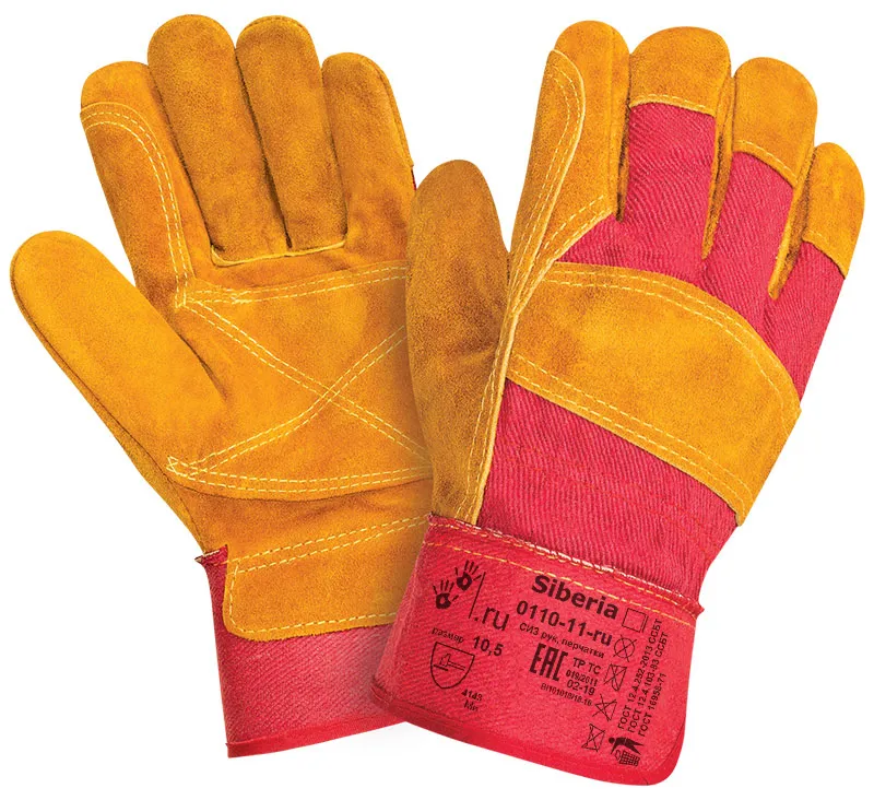 Перчатки тип "СИБИРЬ" для защиты от механических воздействий, комбинированные, плотная смесовая ткань красного цвета со спилком специальной селекции для серии "СИБИРЬ" , дополнительная спилковая накладка на ладони и пальцах для лучшей защиты от пореза и прокола, защитная крага(прорезиненный жесткий защитный манжет), флисовая подкладка из хлопка на ладонной части и пальцах, имеет в серии "СИБИРЬ" специальную конструкцию, обеспечивающую лучшую защиту пальцев от швов и комфорт. Спилок КРС специально отбираемый для серии СИБИРЬ - только спинная часть шкур, прошедших предварительный отбор ,спилок однородный, сорт АВ (1,4+/– 0,2 мм), шлифованный, желтого (золотого) цвета, двойные швы. Перчатки обеспечивают высокий комфорт, высокий уровень защиты от истирания и разрыва, хорошие показатели защиты от пореза и прокола. Перчатки рекомендованы для продолжительного ношения, могут быть использованы для проведения общих работ для защиты от механических воздействий в отсутствии жидких загрязнителей, таких как масло, водные растворы и тд, для защиты рук от ОПЗ, истирания, при работе с абразивами. Размер 10.5, 11.5.