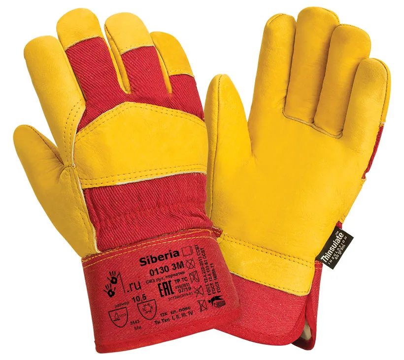Перчатки "Сибирь" 3М для защиты от механических воздействий и пониженных температур, комбинированные, плотная смесовая ткань красного цвета кожей КРС желтого (золотого) цвета специальной селекции для серии Сибирь, с подкладкой из искусственного меха, с защитной крагой (прорезиненный жесткий защитный манжет), общая длина 270 мм +/-5мм. Кожа КРС из спинной части шкур молодых телят, мягкая и растяжимая при значительной толщине (1,4 мм +/– 0,2), сорт А+. На запястье резинка, двойные швы. Утеплитель - оригинальный Thinsulate 40C (Тинсулейт 40 г/м2) производства 3М. Используется специальный Тинсулейт для изготовления перчаток, который отличается значительно меньшей, чем мех, толщиной, но при этом не уступает лучшим свойствам меха Siberia. Этот утеплитель имеет высокие (в сравнении с мехом) показатели влагопоглощения и влагоиспарения, обеспечивает лучшую чувствительность и удобство манипулирования, при сопоставимых с мехом Siberia теплосберегающих свойствах. Утеплитель полностью сшит по периметру, для обеспечения наивысшего комфорта при использовании. Перчатки предназначены для защиты рук от ОПЗ, истирания, обеспечивают высокий уровень комфорта, чувствительности пальцев и удобство манипулирования при высоких показателях механической защиты и защиты от пониженных температур. Рекомендованы для продолжительного ношения в условиях низких температур, во всех климатических поясах, с разумными ограничениями в соответствии с рекомендациями стандарта ТР ТС и EN511-2012 - зависящими от таких факторов как влажность, ветер, интенсивность нагрузок. При температурах ниже -40С, продолжительное использование перчаток не рекомендуется. Для принятия решения о применимости перчатки, рекомендуем проводить производственные испытания. Перчатки могут быть использованы для проведения общих работ в отсутствии жидких загрязнителей, таких как масло, водные растворы и тд, при работе с инструментом, для водителей , ИТР.