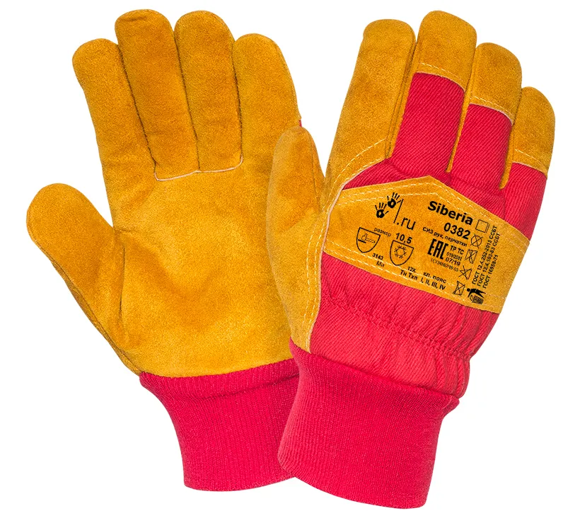 Перчатки "Сибирь" для защиты от механических воздействий и пониженных температур, комбинированные , плотная смесовая ткань красного цвета со спилком КРС с подкладкой из искусственного меха, полушерстяной трикотажный манжет, общая длина 270 мм +/-5мм. Спилок КРС специально отбираемый для серии Siberia - только спинная часть шкур, прошедших предварительный отбор, спилок однородный, сорт АВ (1,3+/– 0,2 мм), шлифованный, желтого (золотого) цвета. На запястье резинка, двойные швы. В перчатках использован мех, специально изготавливаемый для серии Сибирь, отличающийся повышенной комфортностью за счет отсутствия вторсырья и высокого содержания хлопка, а так же высокими теплосберегающими свойствами и износостойкостью при большой плотности и длине ворса. Мех полностью сшит по периметру, для обеспечения наивысшего комфорта при использовании. Перчатки предназначены для защиты рук от ОПЗ, истирания, обеспечивают высокий уровень комфорта, удобство манипулирования при высоких показателях механической защиты и защиты от пониженных температур. Рекомендованы для продолжительного ношения в условиях низких температур, во всех климатических поясах, с разумными ограничениями в соответствии с рекомендациями стандарта ТР ТС и EN511-2012 - зависящими от таких факторов как влажность, ветер, интенсивность нагрузок. При температурах ниже -40С продолжительное использование перчаток не рекомендуется. Для принятия решения о применимости перчатки, рекомендуем проводить производственные испытания. Перчатки рекомендованы для использования с зимней одеждой, конструкция которой подразумевает размещение перчатки внутри рукава и могут быть использованы для проведения общих работ в отсутствии жидких загрязнителей, таких как масло, водные растворы и тд, при работе с инструментом, для водителей, ИТР. Размер 10,5