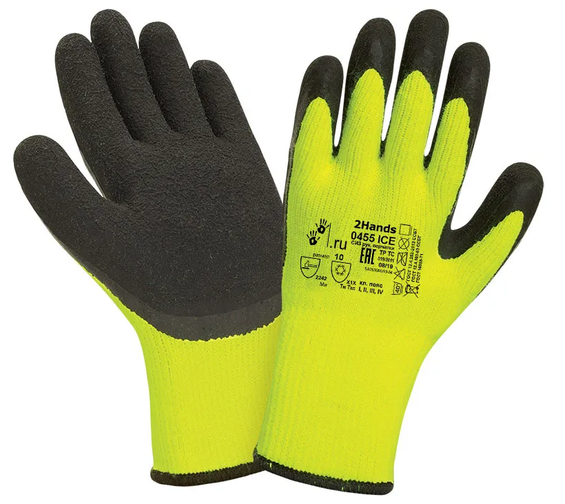Перчатки 2Hands (Ту Хэндс) Polar ICE (Полярный лед) 0455 ICE для защиты от механических воздействий и пониженных температур. Перчатки являются отличной альтернативой зимним перчаткам из натуральных материалов. При сохранении высокого комфорта, они защищены от влаги, что является недостатком перчаток из кожи и спилка их можно сушить без потери защитных свойств, возможна стирка. Перчатки обливные - бесшовная трикотажная основа с ворсом, с внутренней стороны перчатки - акриловый трикотаж плотностью 7 петель ярко-желтого (сигнального) цвета (трикотаж 7G более толстый, чем 10G, вследствие чего перчатки обеспечивают большую защиту от холода и комфорт), с частичным покрытием ладони и пальцев вспененным латексом. Технология покрытия натуральным вспененным латексом обеспечивает наилучшую эластичность и мягкость перчатки, что особенно заметно при отрицательных температурах, обеспечивает надежный захват скользких предметов, отличную чувствительность пальцев и комфорт для руки. Перчатки обеспечивают защиту от холода, ОПЗ и нетоксичных жидких загрязнений в незначительных объемах (покрытие "дышащее" и противостоит жидким загрязнителям не продолждительноевремя), высокие показатели механической защиты и износостойкости. Прочные перчатки, рекомендованы для работы в зимний период, в производственных помещениях с пониженной температурой и на открытом воздухе. Рекомендуются для применения при температуре воздуха до -25С. Перчатки подходят для работ в зимний период в сфере добычи и переработки полезных ископаемых (в условиях допустимого уровня загрязнения жидкими химикатами), для проведения сборочных операций, складских работ, общих строительных и ремонтных работах, в сфере переработки и сельского хозяйства, автосервисе, и т.д.