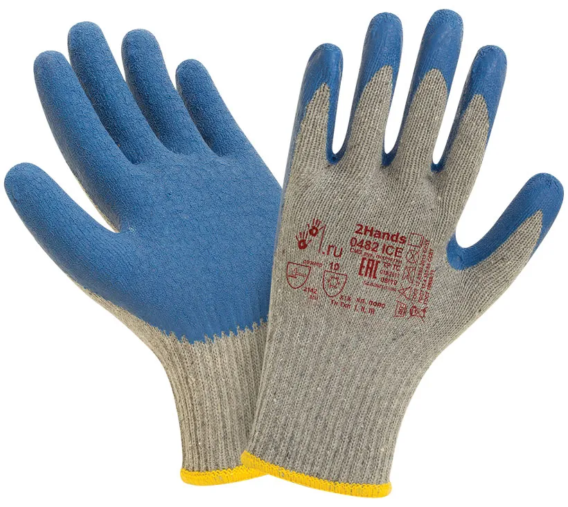 Перчатки 2Hands 0482 ICE (Ту Хэндс 0482 Айс) для защиты от механических воздействий и пониженных температур. Перчатки с частичным рельефным покрытием латексом (1,7мм) ладони и пальцев, бесшовная плотная трикотажная основа - полиэфир/хлопок плотностью 10 петель,с ворсом, с внутренней стороны перчатки, манжет - резинка. Тыльная сторона обеспечивает доступ воздуха к руке, высокая чувствительность пальцев, хороший сухой и влажный захват, перчатки обладают растяжимостью и гибкостью, а так же повышенным сопротивлением разрыву. Прочные перчатки, рекомендованы для работы в осенне-зимний период, в производственных помещениях с пониженной температурой. Не рекомендуются для постоянного ношения при температуре воздуха ниже -5С. Перчатки для работ со скользкими и гладкими поверхностями, подходят для сборочных операций, складских работ, общих строительных и ремонтных работах, в сфере переработки и сельского хозяйства, автосервисе, в качестве садовых перчаток.